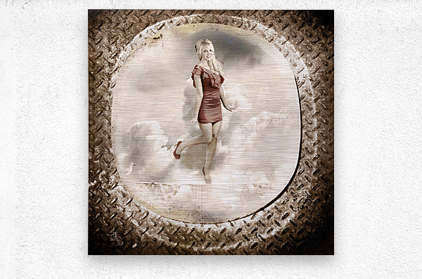 Grunge military portrait taken from a vintage plane window of a retro pin-up woman balancing on a decorated flag line. Forties and fifties australian ...[+]