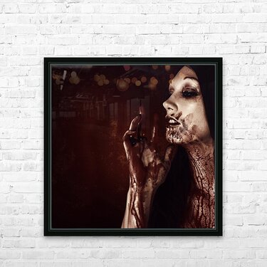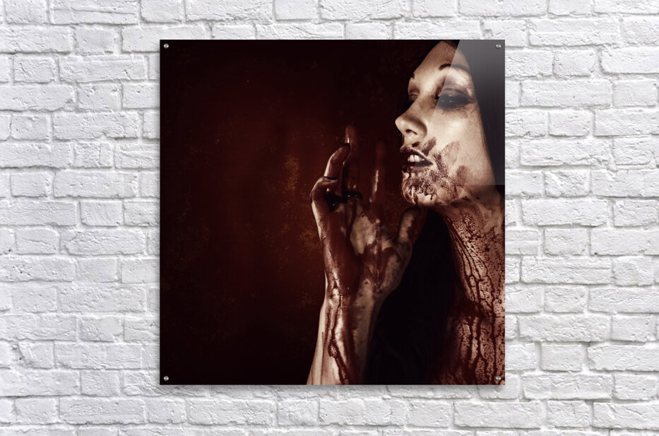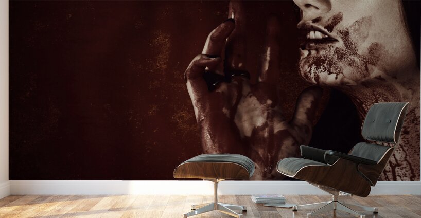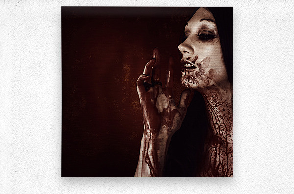 Fine art horror picture of a sensual vampire woman touching tasting and smelling blood on hand. Touch of death