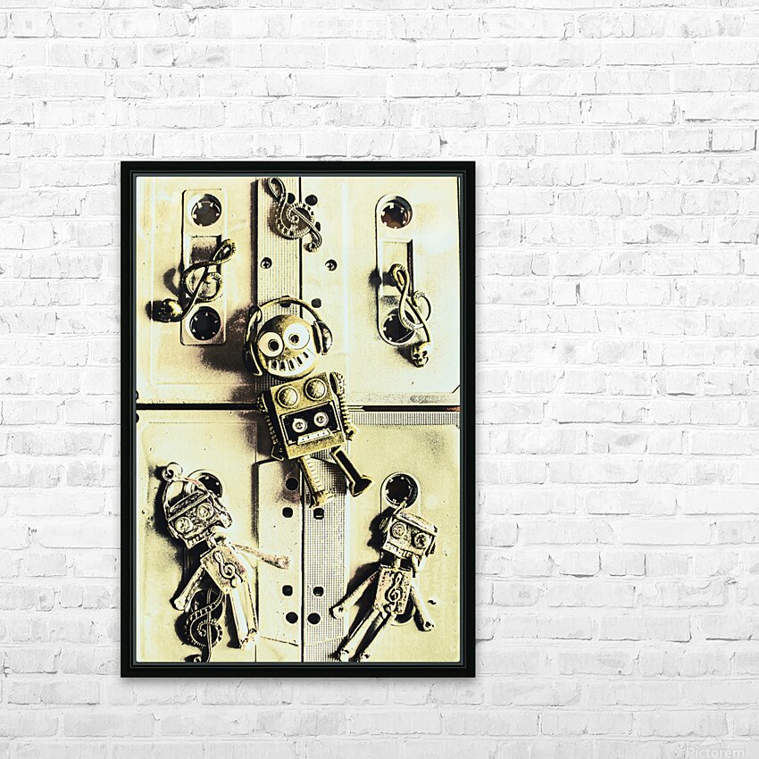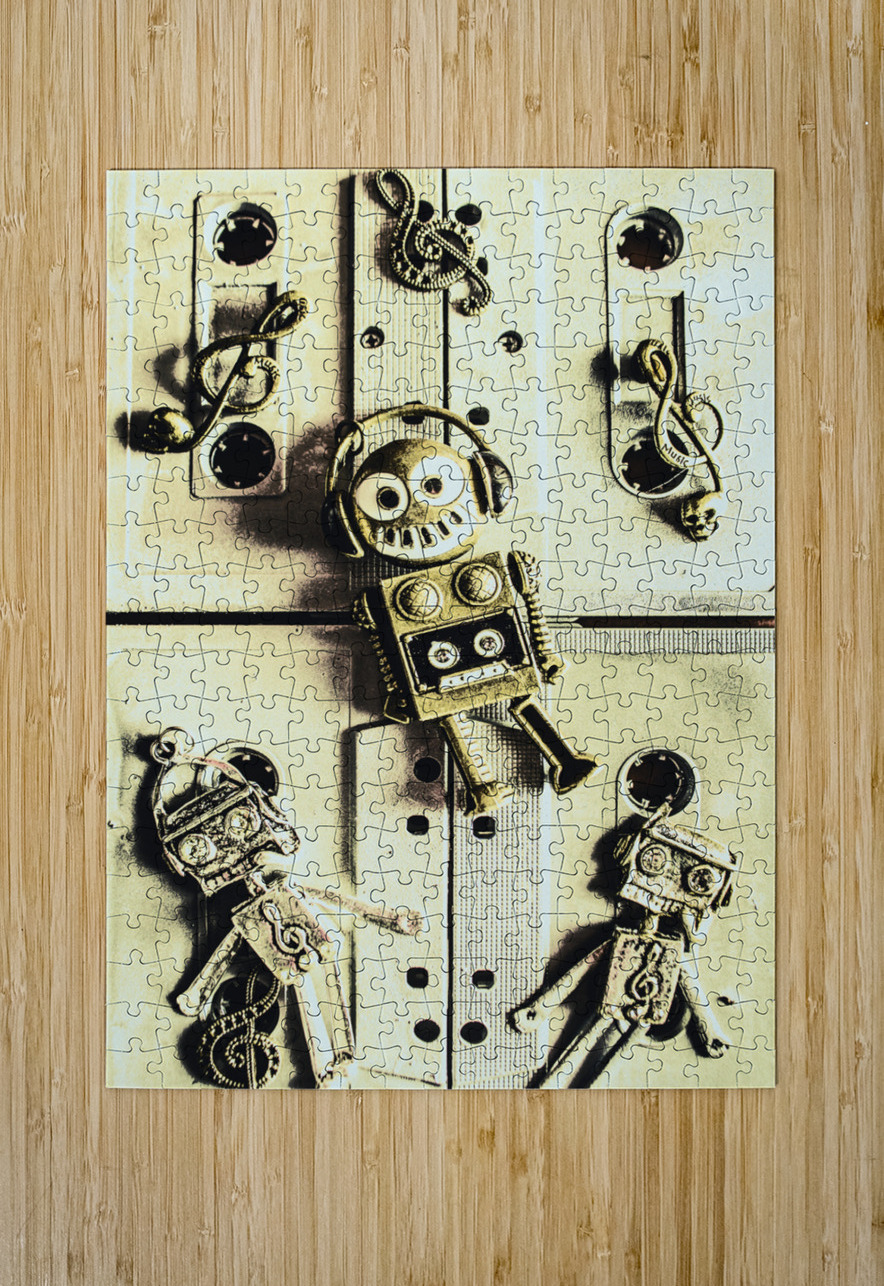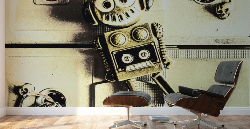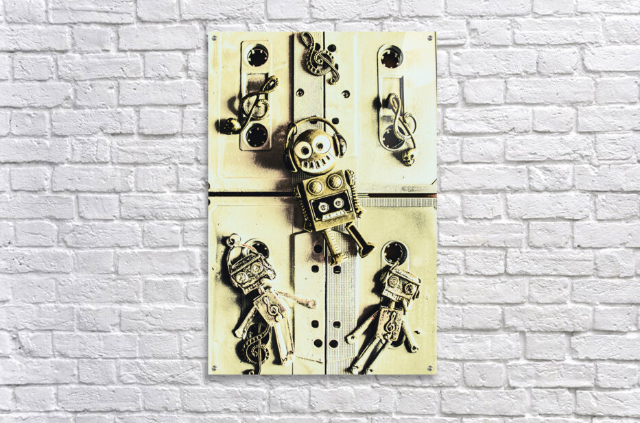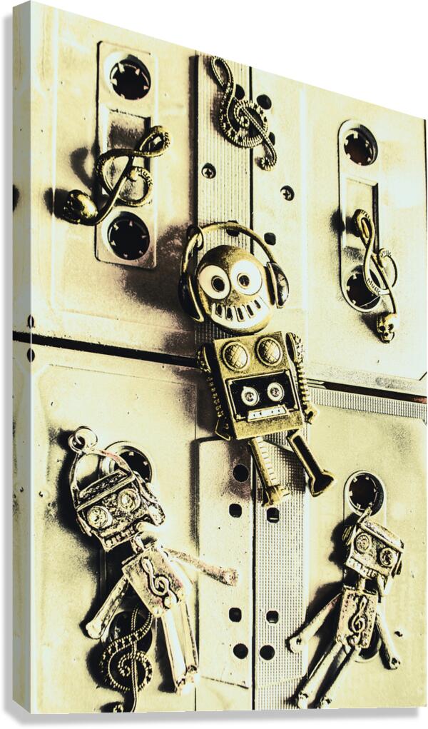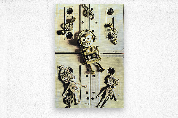 Old 80s scene on a group of musical tin robots with notes and cassette tapes. Stereo robotics art