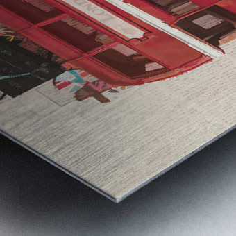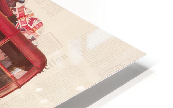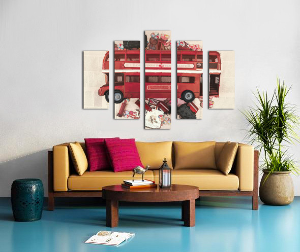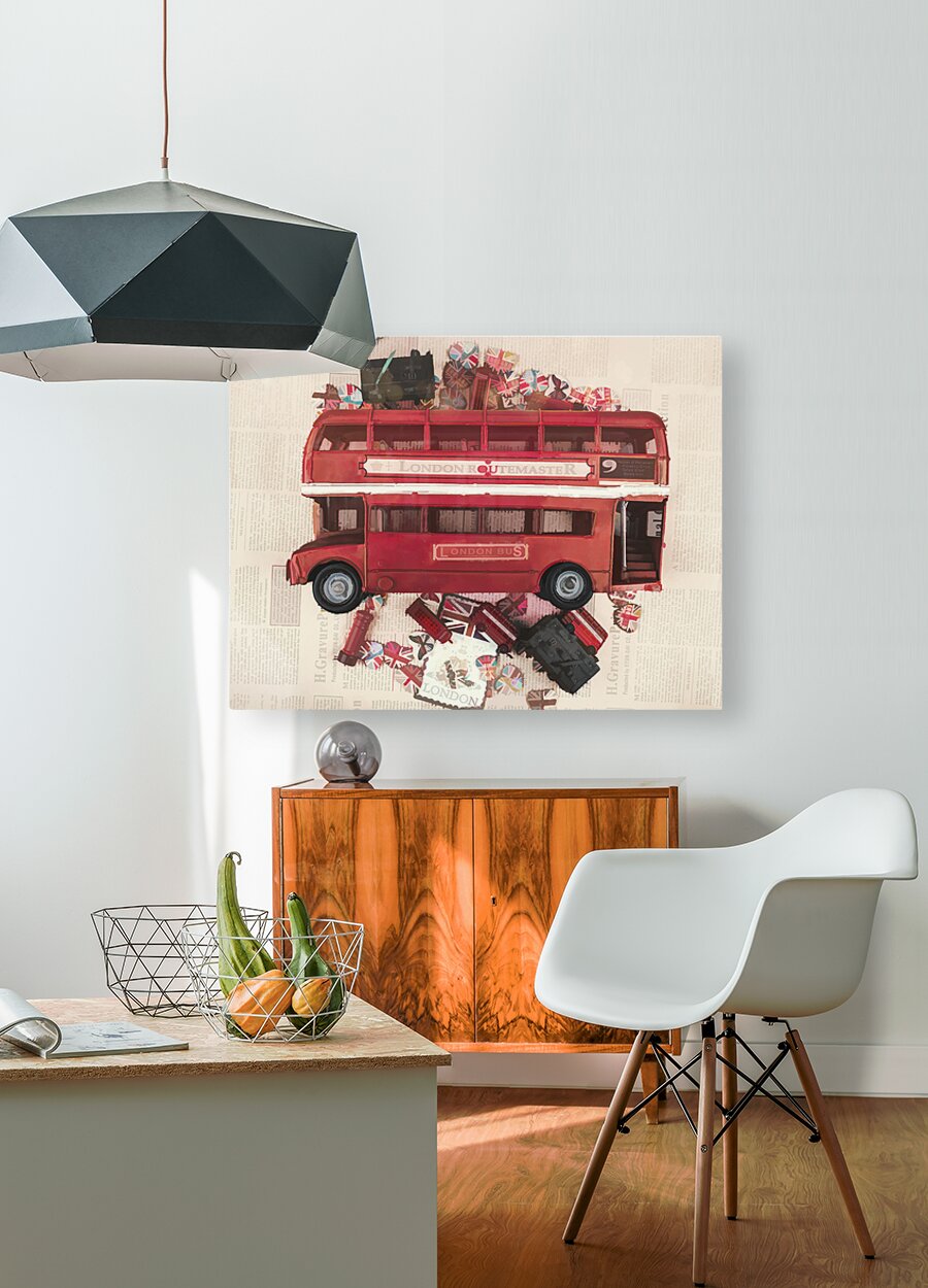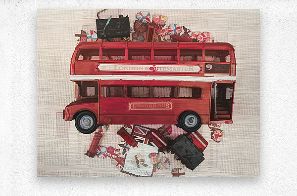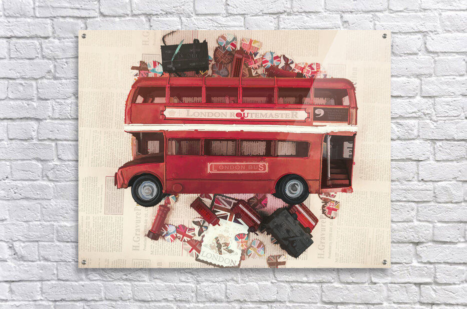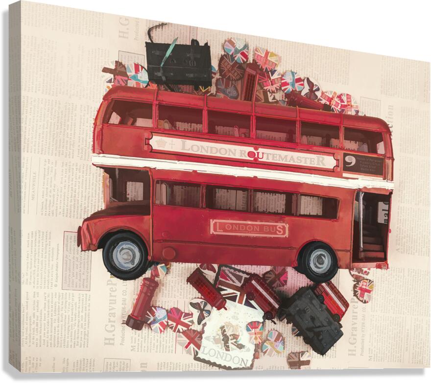 Painterly scene of old English art with vintage red bus abstracted by icons of charming British heart