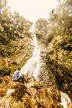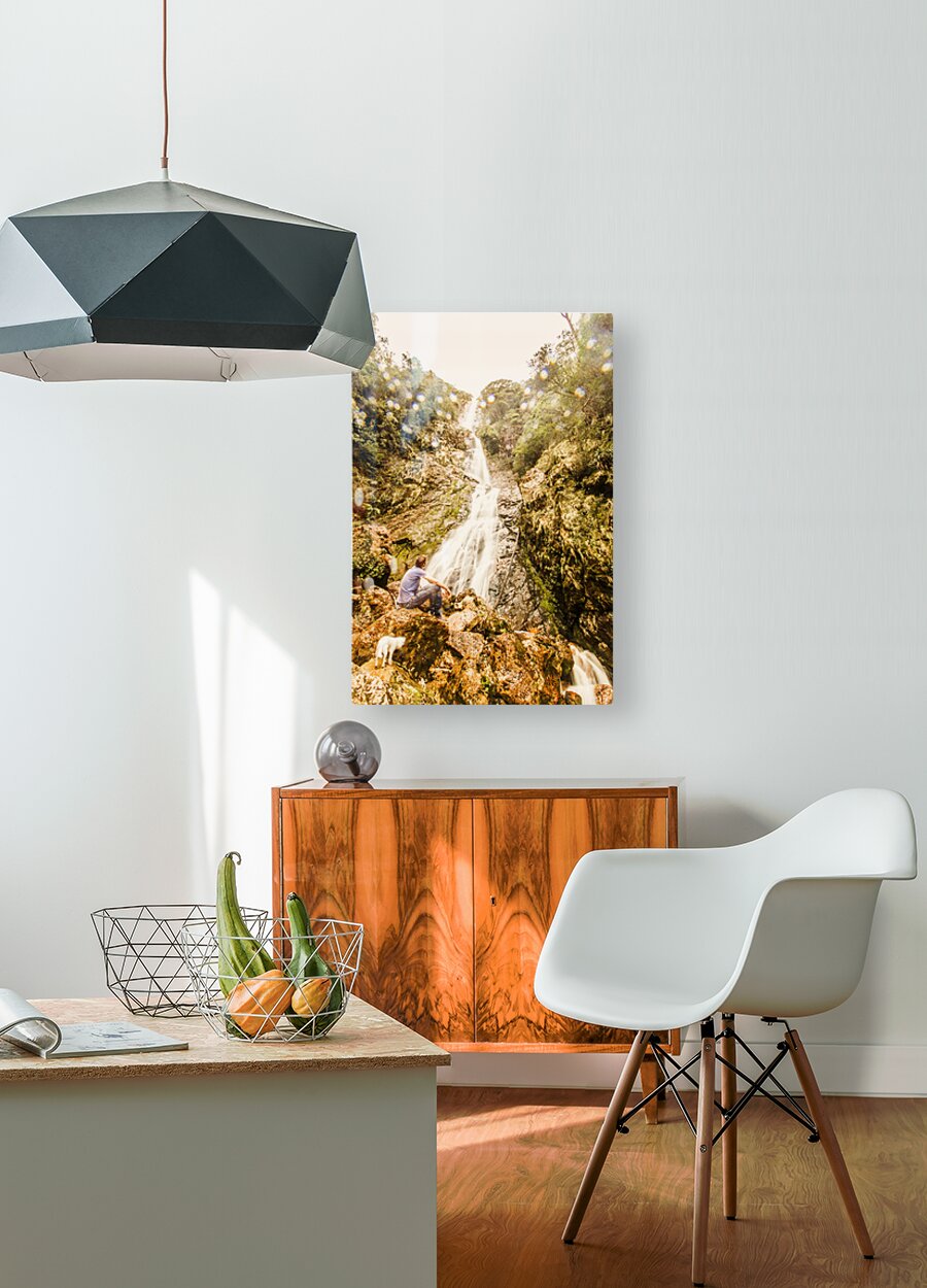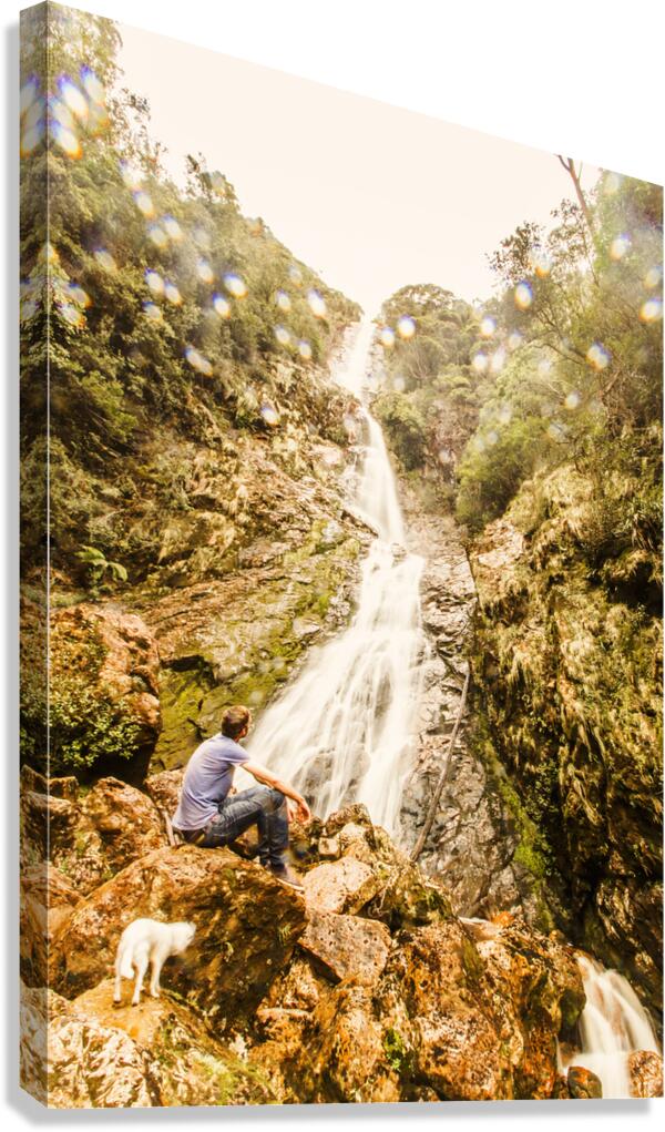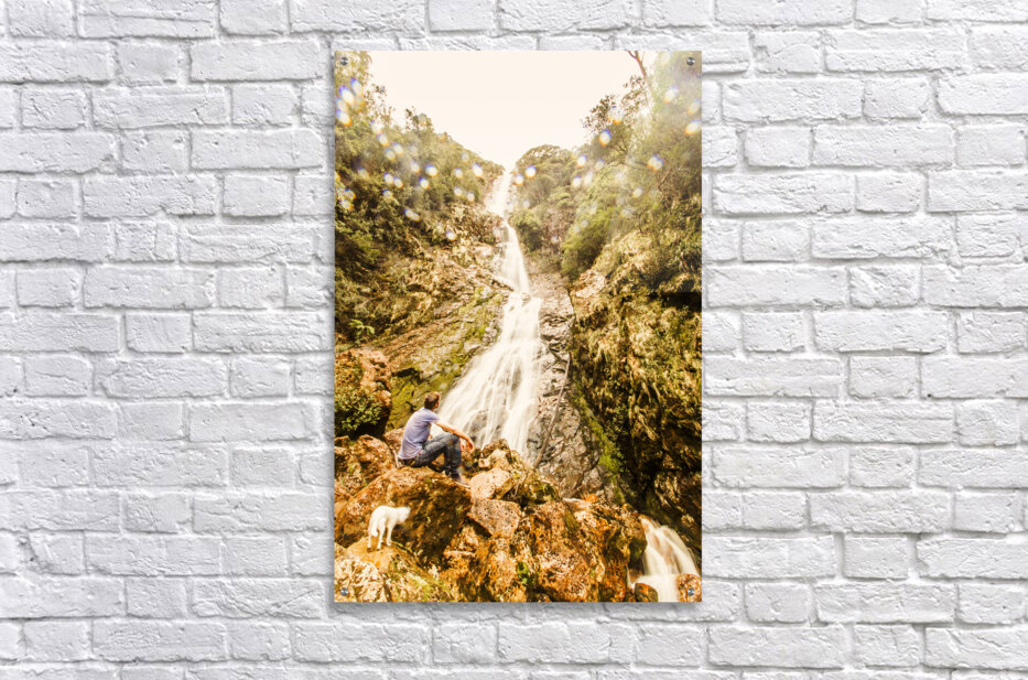 Travel and tourism photo on a man and his small white dog exploring falls in West Coast Tasmania. Montezuma Falls Rosebery Australia