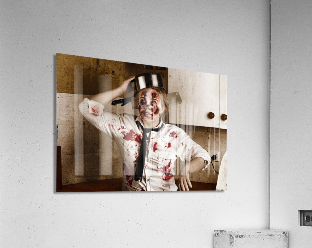 Get this artwork "Funny zombie cook dancing in horror kitchen" in a framed print.