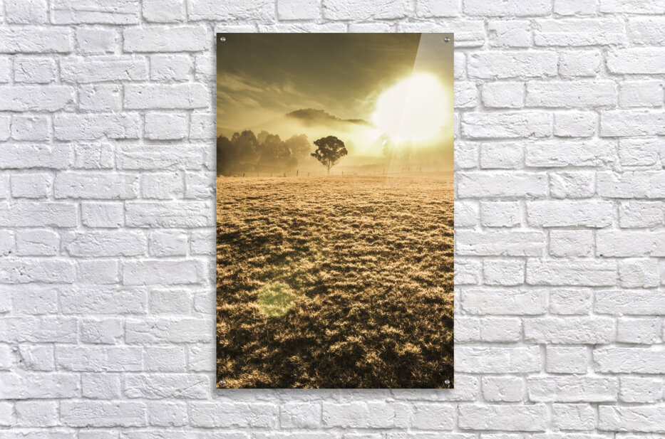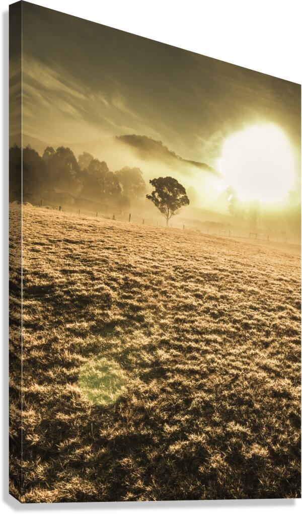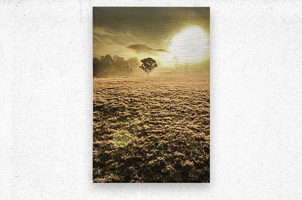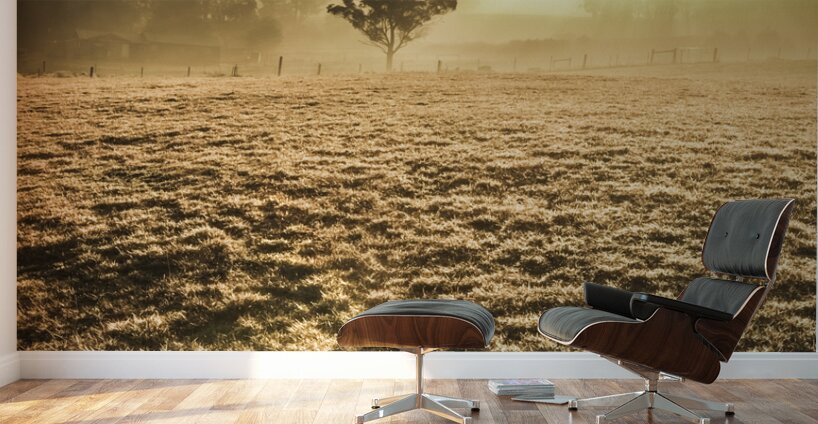 Morning sunlit scene of a empty misty field with distant tree in a backlight of haze. Judbury Tasmania Australia