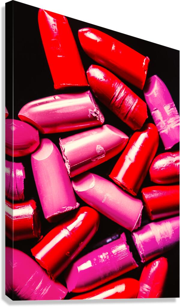 Sliced and diced lipsticks ends in various colors over black beauty background. Make-up abstraction artwork