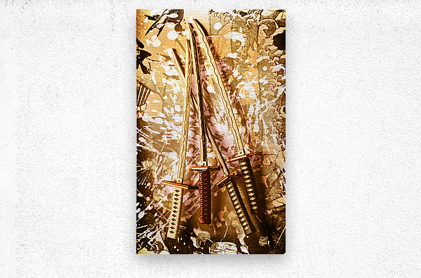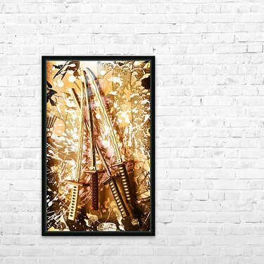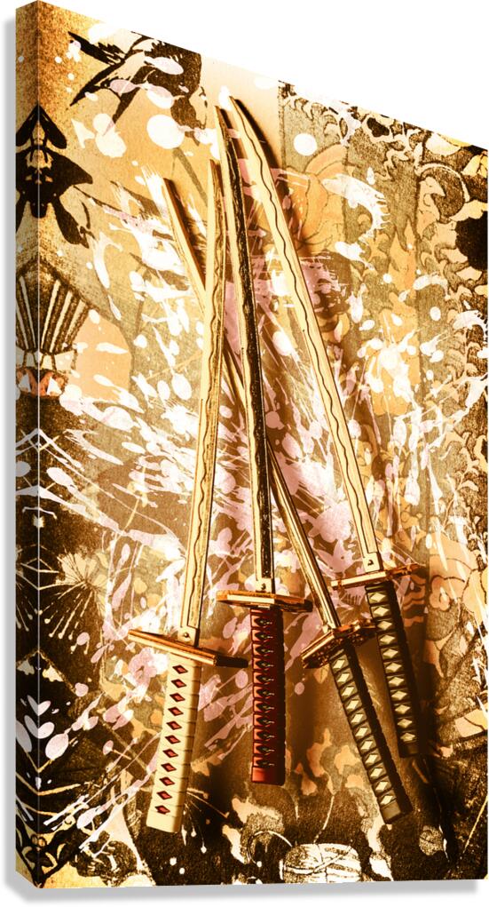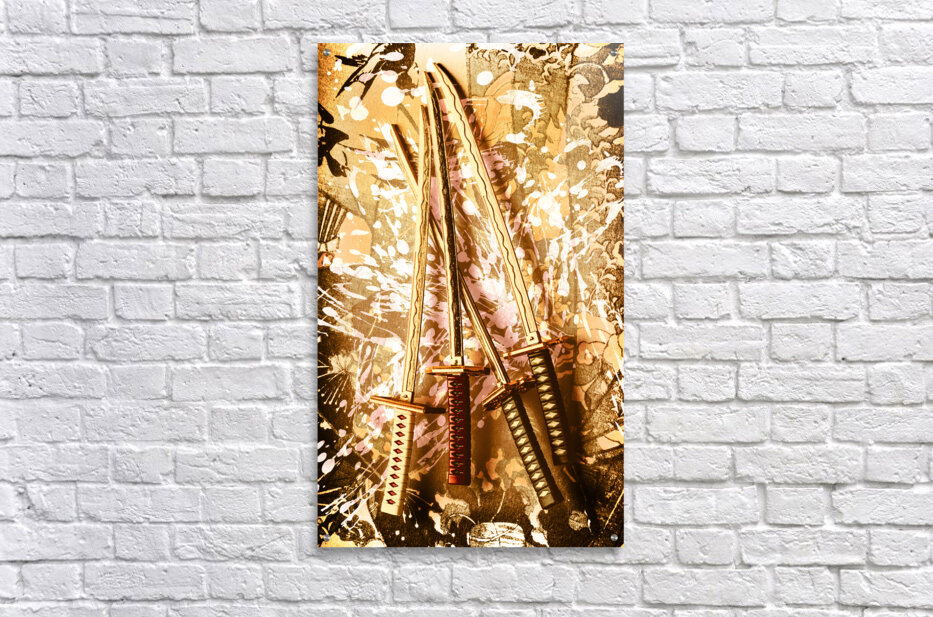 Asian style artwork on a paint splash of 4 swords of oriental antiquity