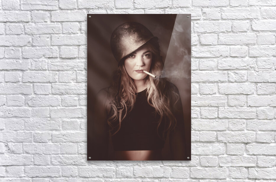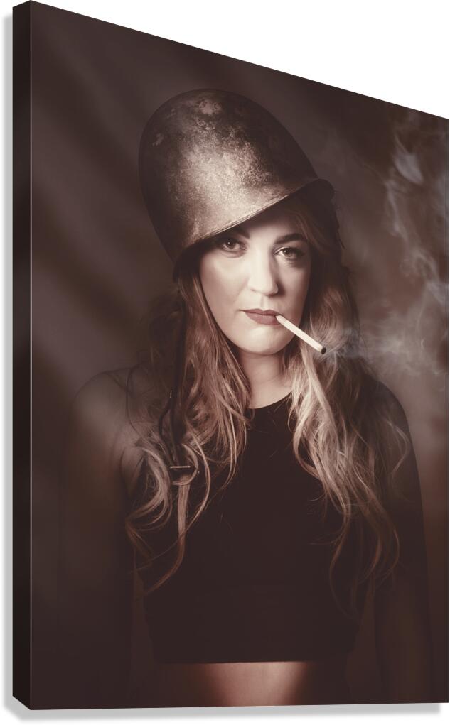 Get this artwork "Beautiful blond army pinup girl smoking cigarette" in a framed print.
