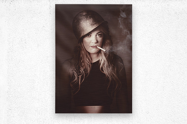 Beautiful blond army pinup girl smoking cigarette in steel helmet. Tough vintage style