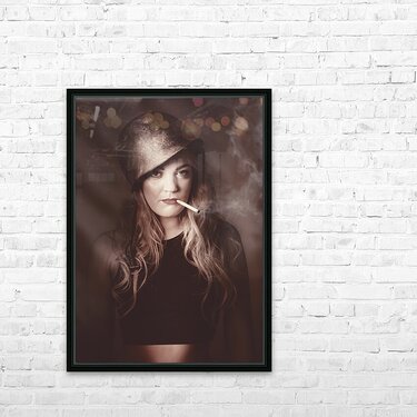Beautiful blond army pinup girl smoking cigarette Frame print