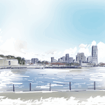 Line art illustration of the Statue of Liberty and downtown New York City on a bright blue sunny day. Travel and tourism concept