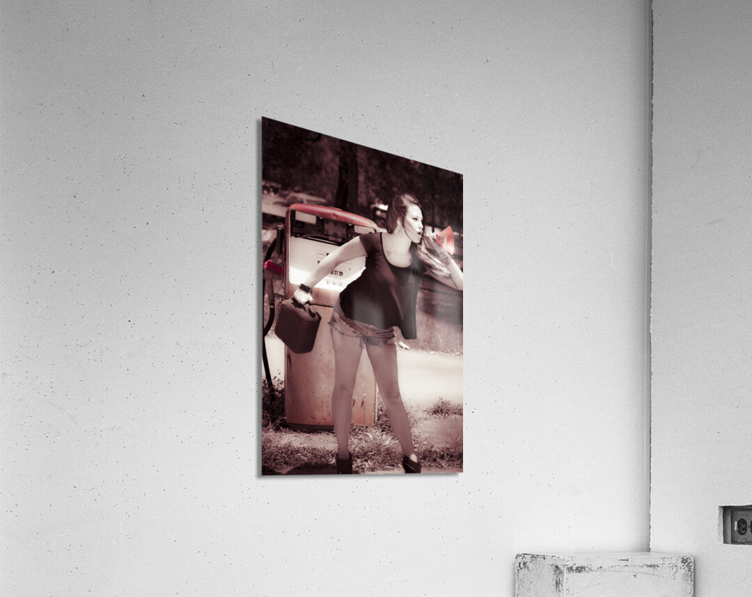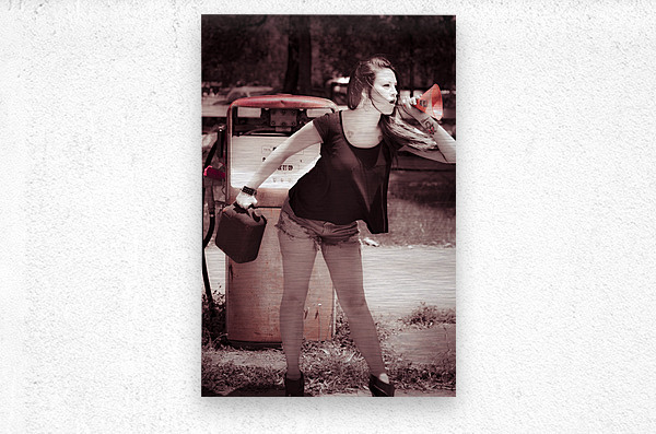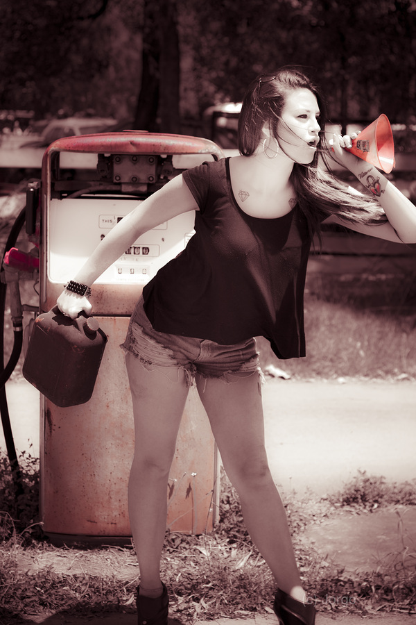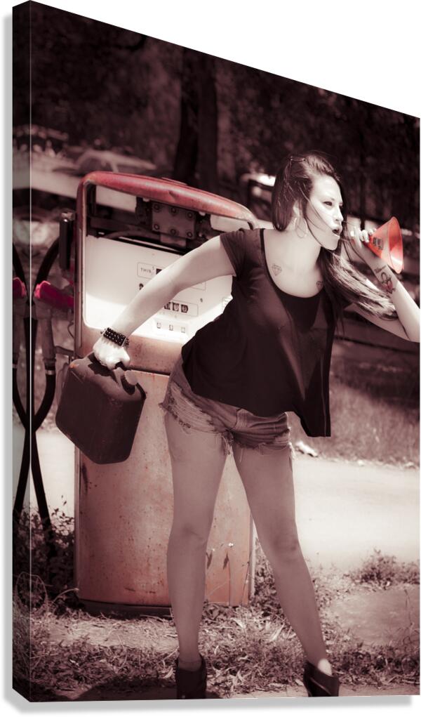 Service station spruiking in a scene of nostalgia by the petrol pump with old automotive girl selling gas savings