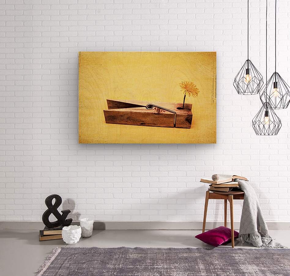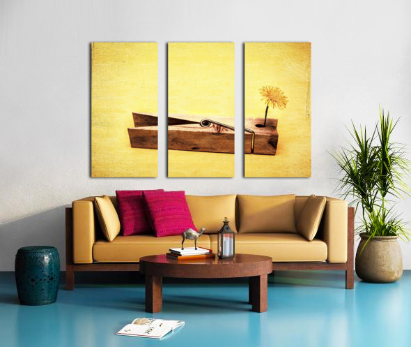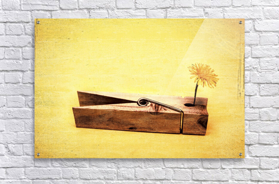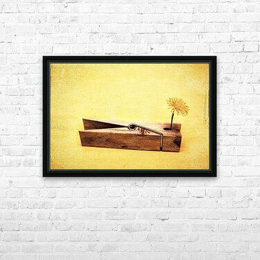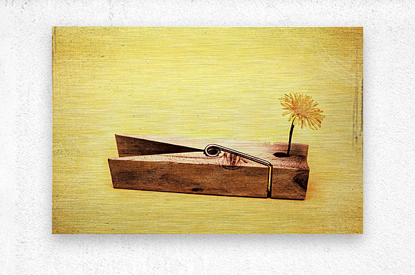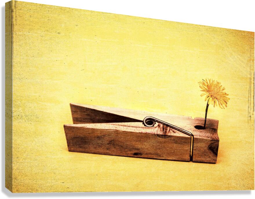 Vintage fine art photo of a clothing peg holding yellow flower. Clothespins and dandelions