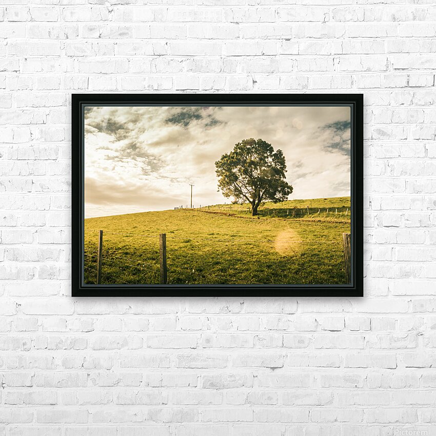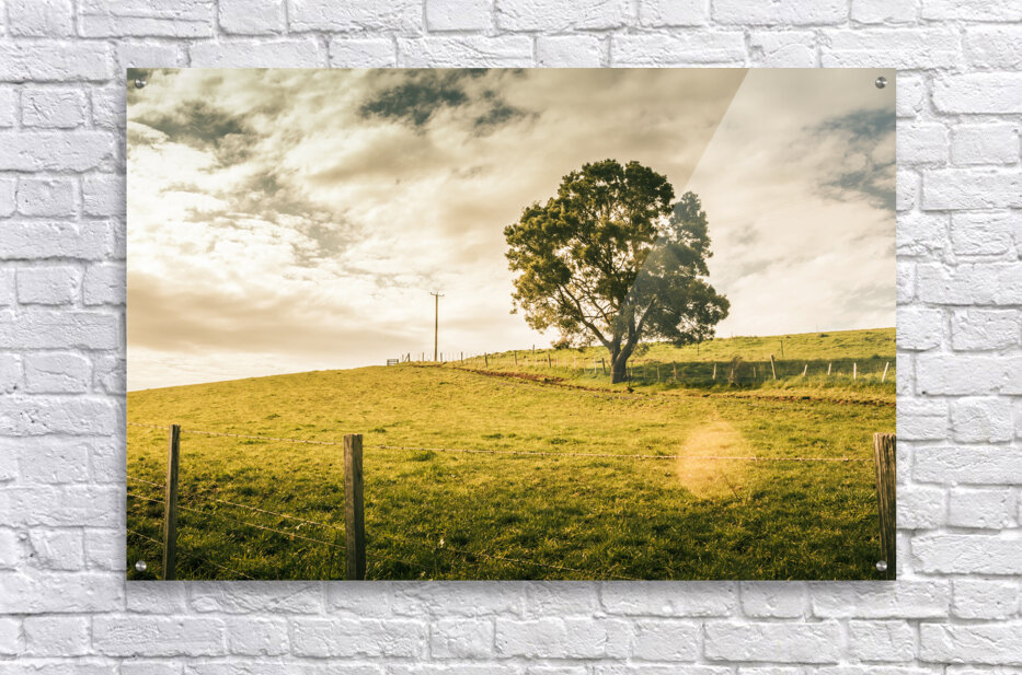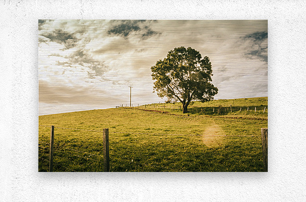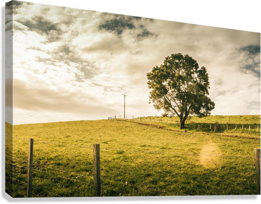 Beautiful Tasmanian farmland view of a lovely green meadow with trees fences and quaint dirt road. North Tas - Camena Tasmania Australia