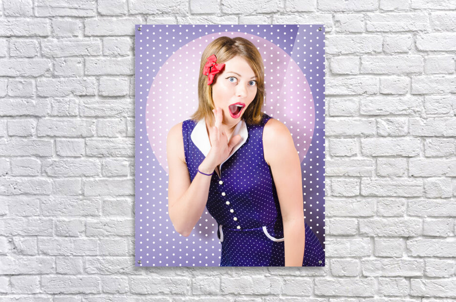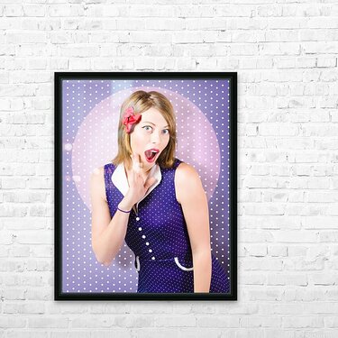 Surprised pin-up woman in purple polka dot dress Picture Frame Printing