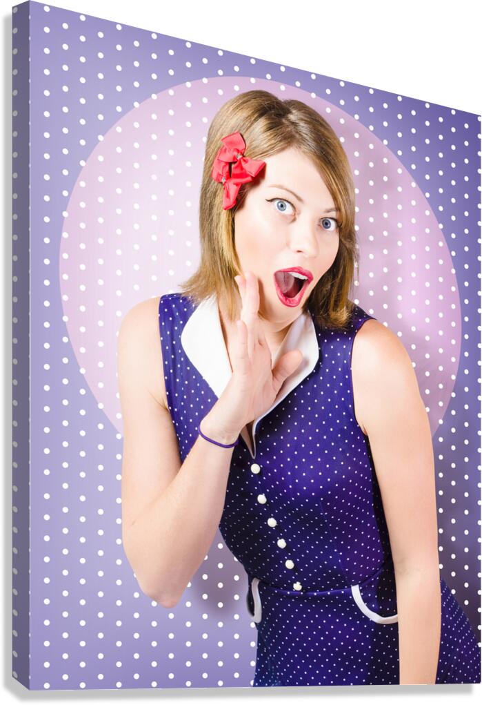 Old-fashioned retro photo of a charming pin-up woman with fun surprised expression on purple polka-dot background