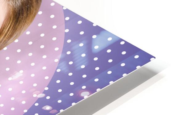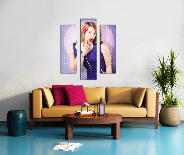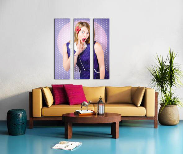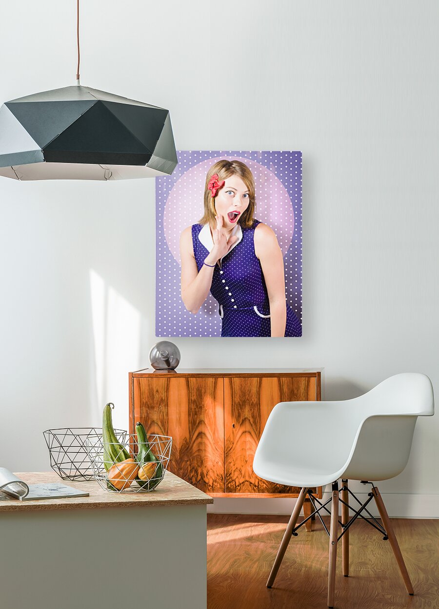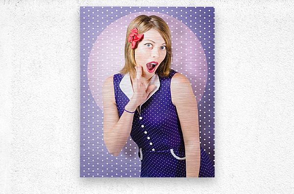 Surprised pin-up woman in purple polka dot dress  Wood print