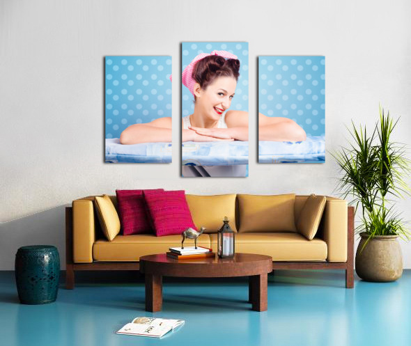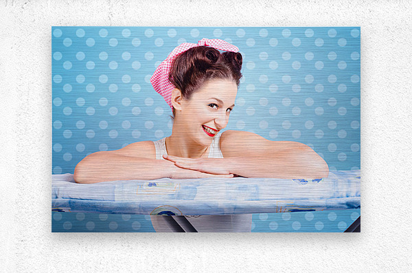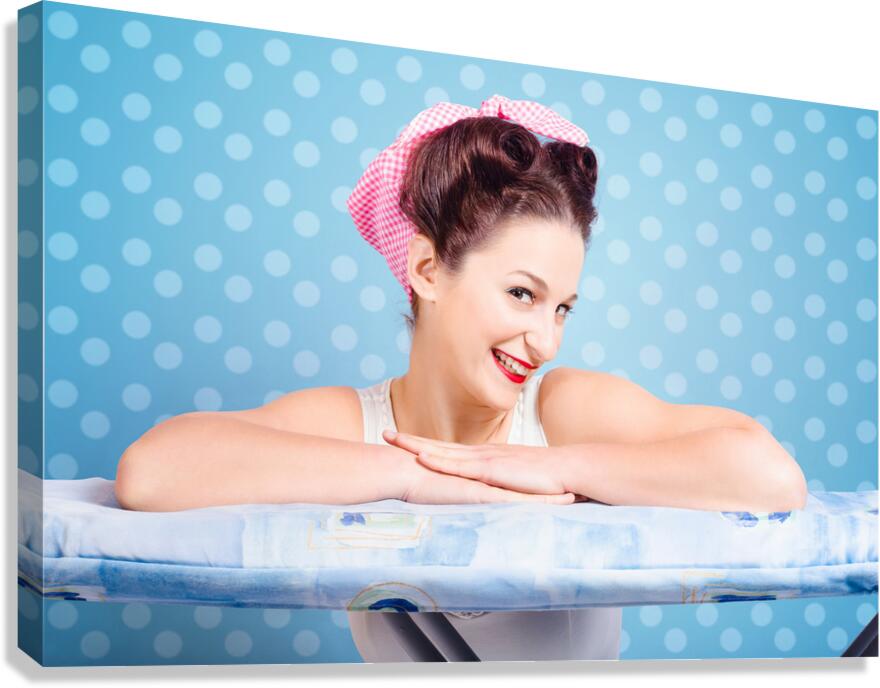 Get this artwork "Happy 60s pinup housewife on blue ironing board" in a framed print.