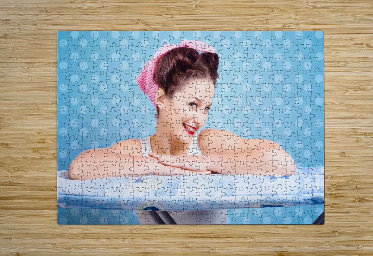 Happy 60s pinup housewife on blue ironing board Jorgo Puzzle printing