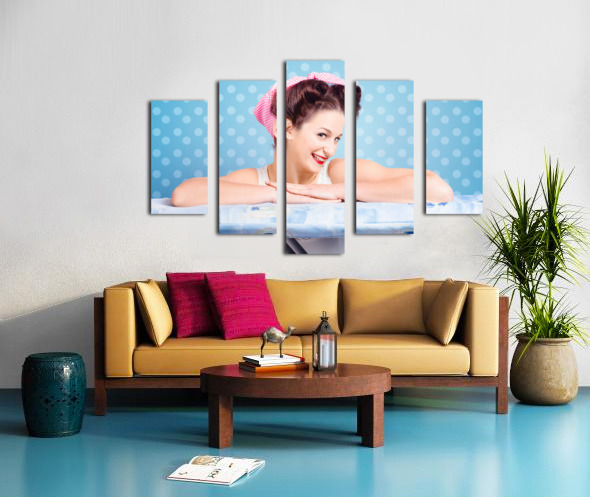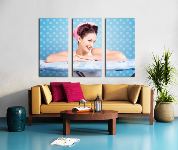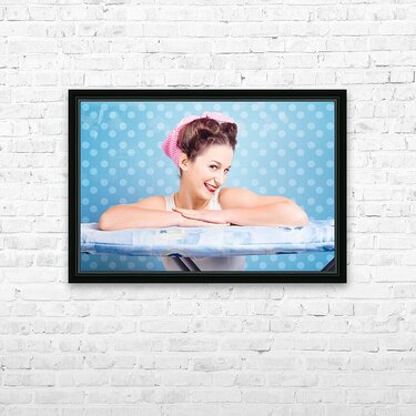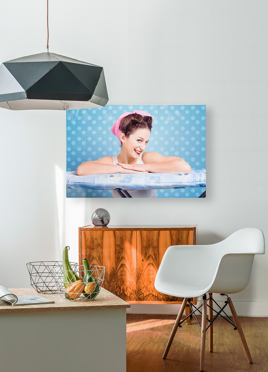 Happy 60s pinup housewife on blue ironing board Picture Frame Printing
