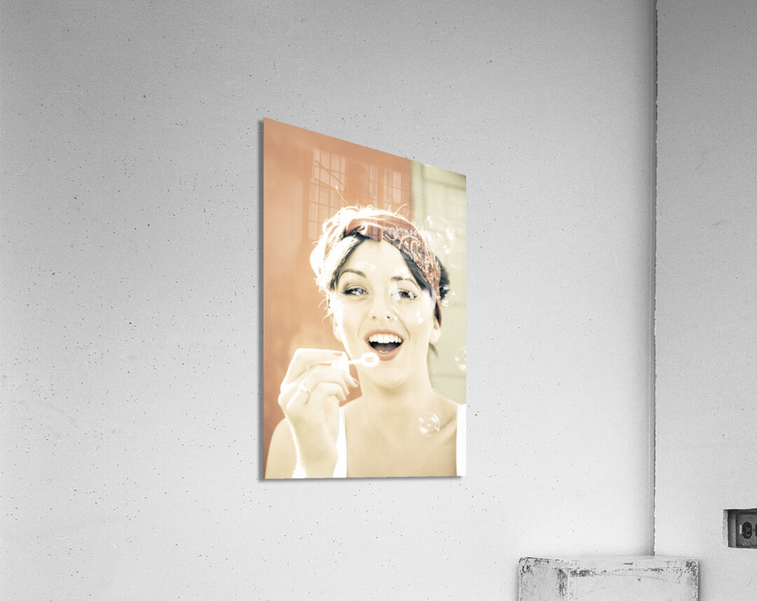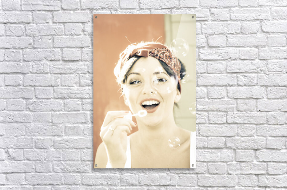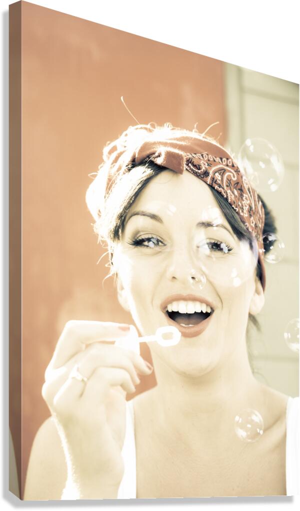 Beautiful Young Female Laughing Giggling And Smiling While Blowing Bubbles Outside In A Fun And Playful Nostalgic Retro Portrait