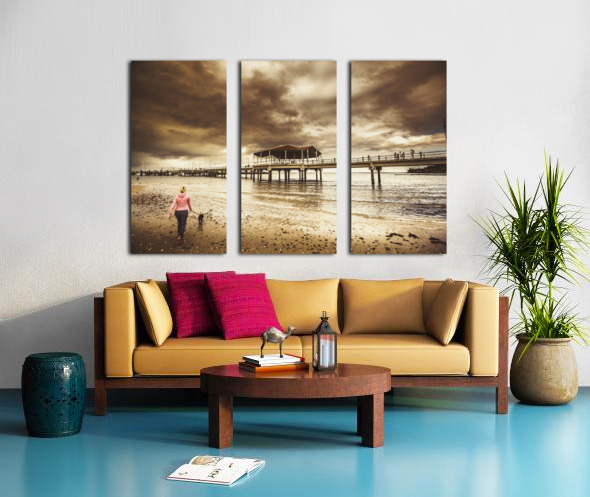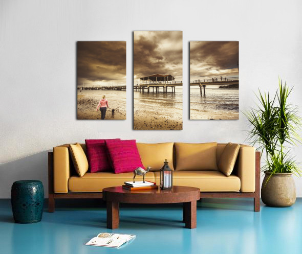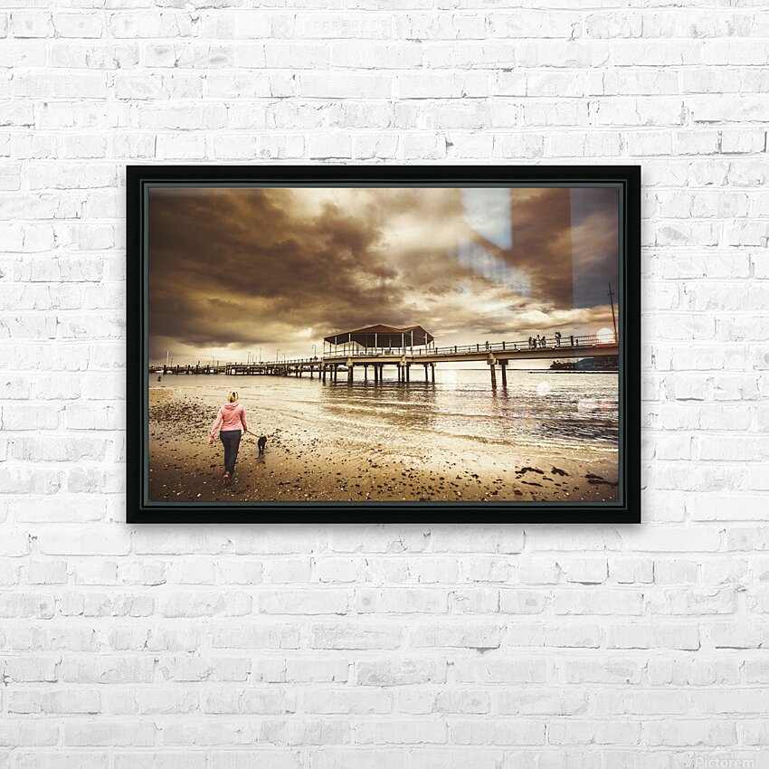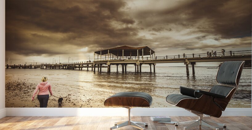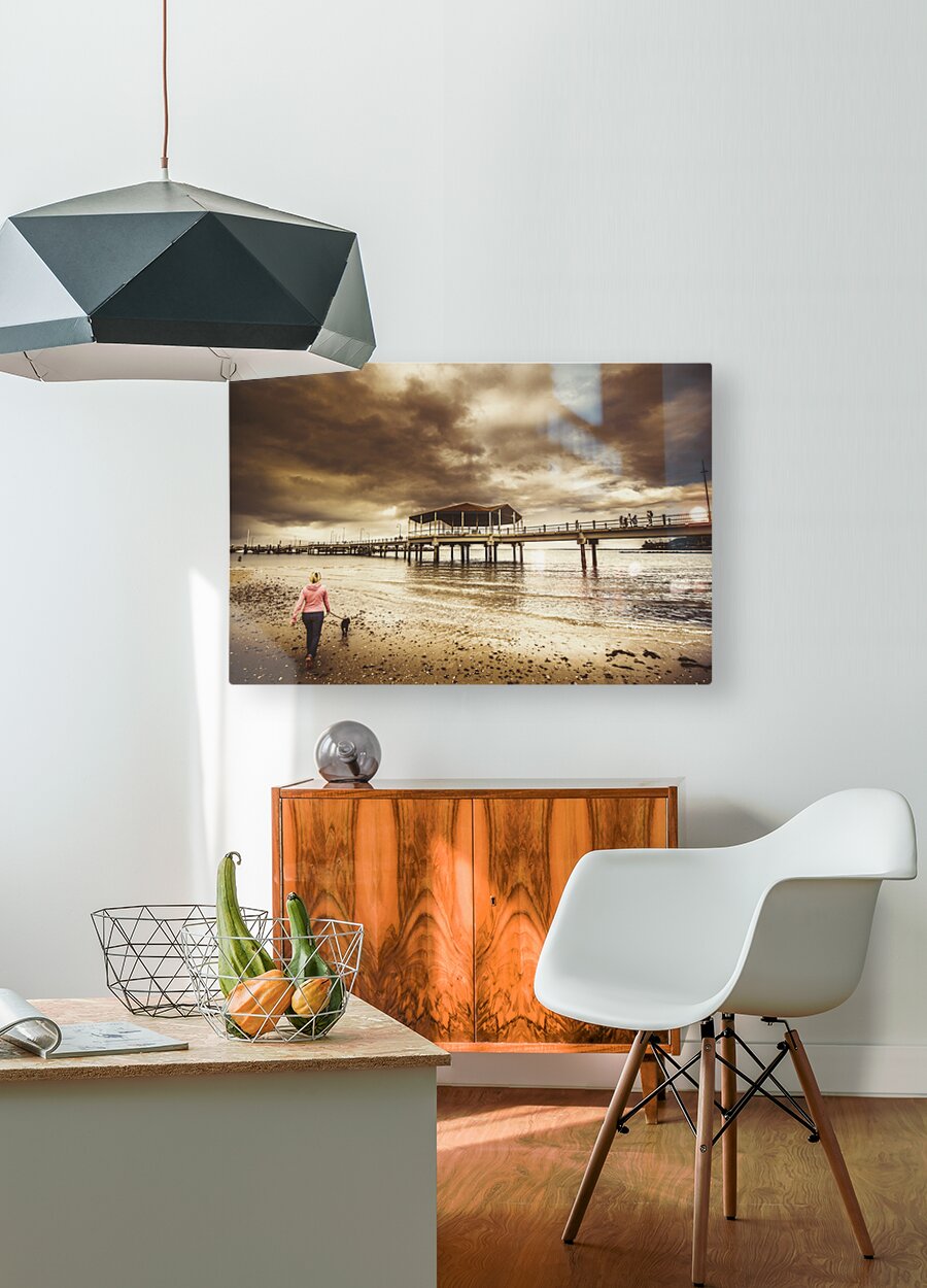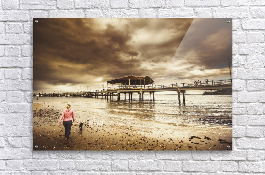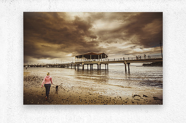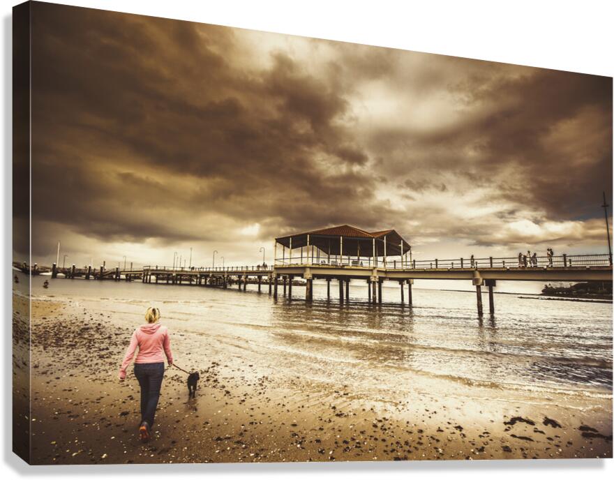 Contrasted lifestyle imagery of a woman walking dog on stormy beach by large jetty. Taken Redcliffe Queensland Australia