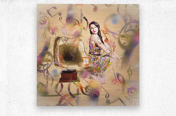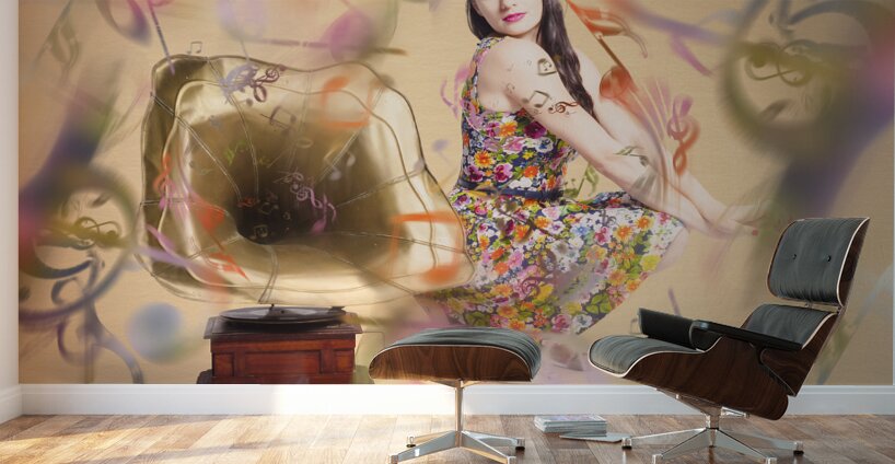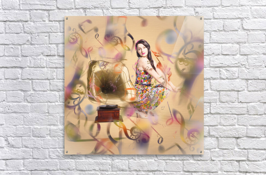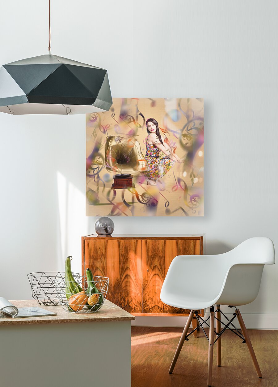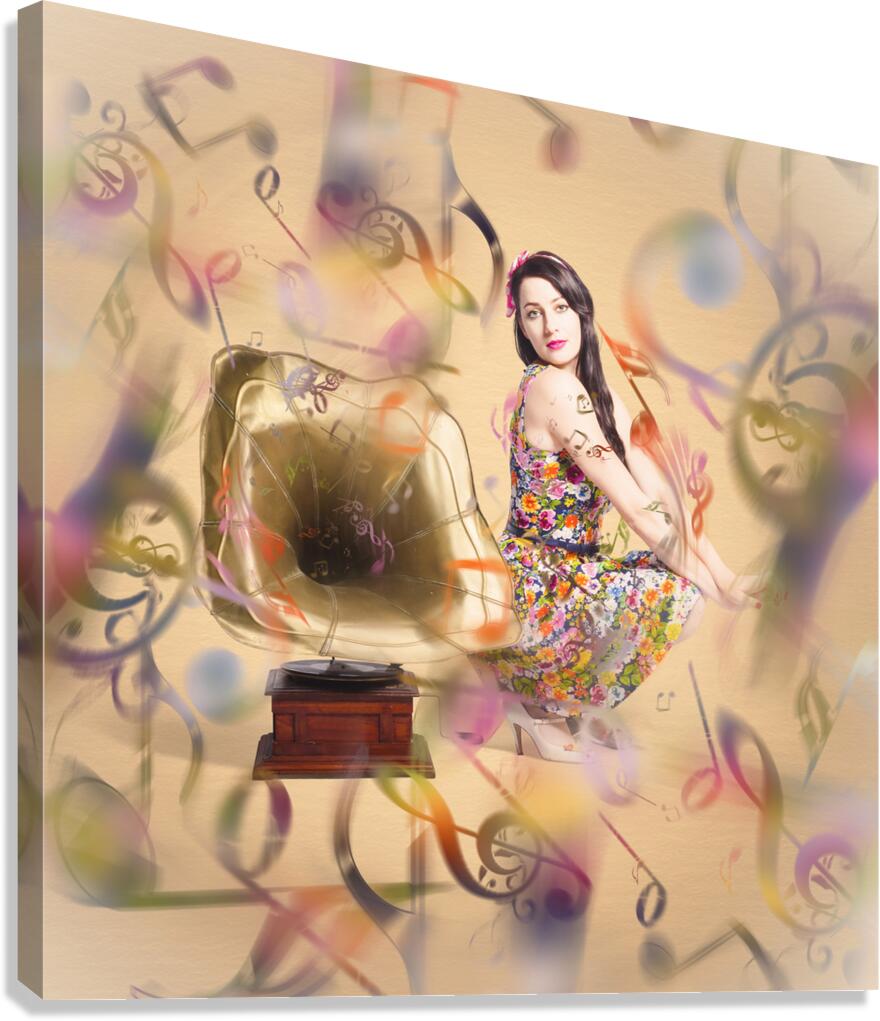 Colorful artistic photo of a fashionable clubbing housewife sending out retro music notes on abstract design gramophone. Pin-up the sound of nostalgia