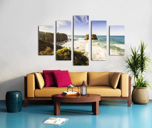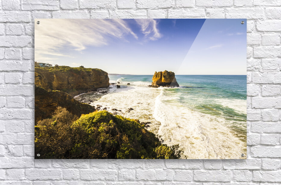 Beautiful landscape with rocky cliffs splashing waves and cloudy blue skies with the focus on the Eagle Rock Tourism landmark. Great Ocean Road Victoria Australia