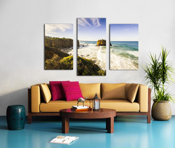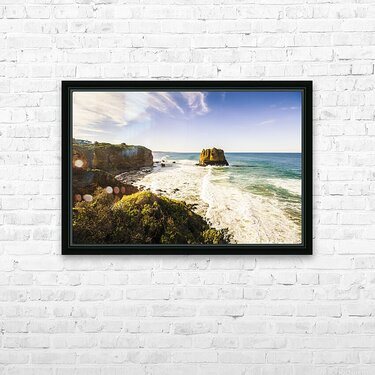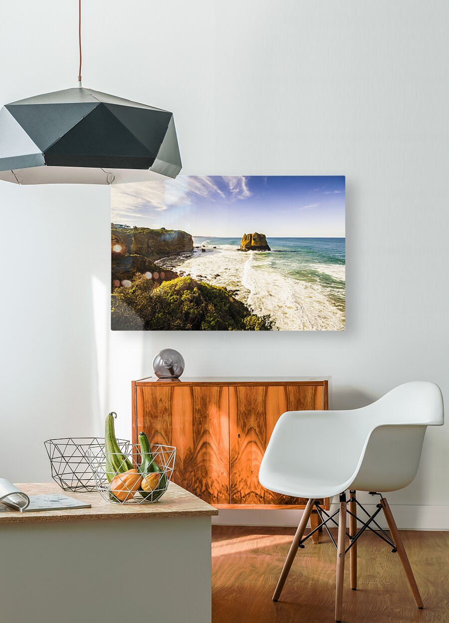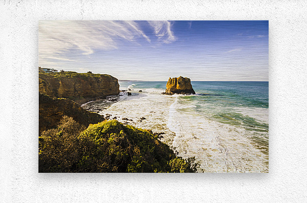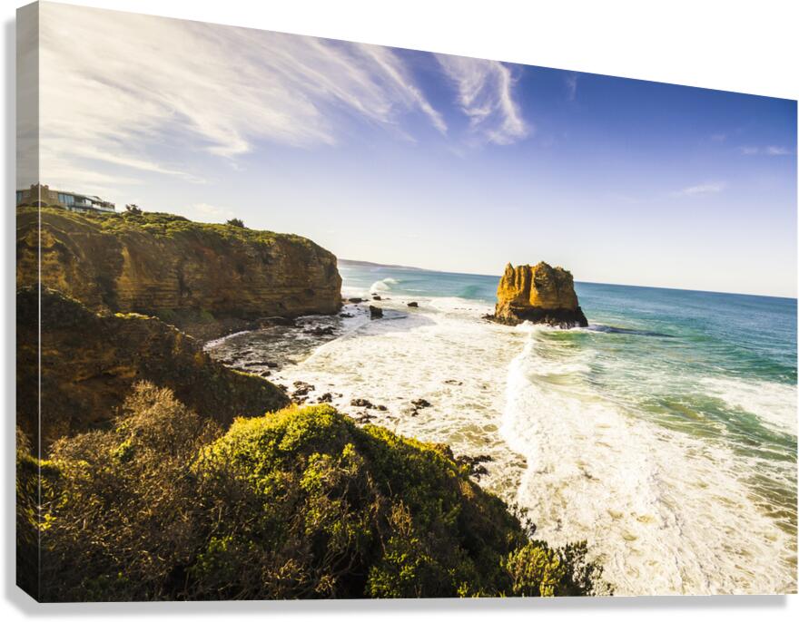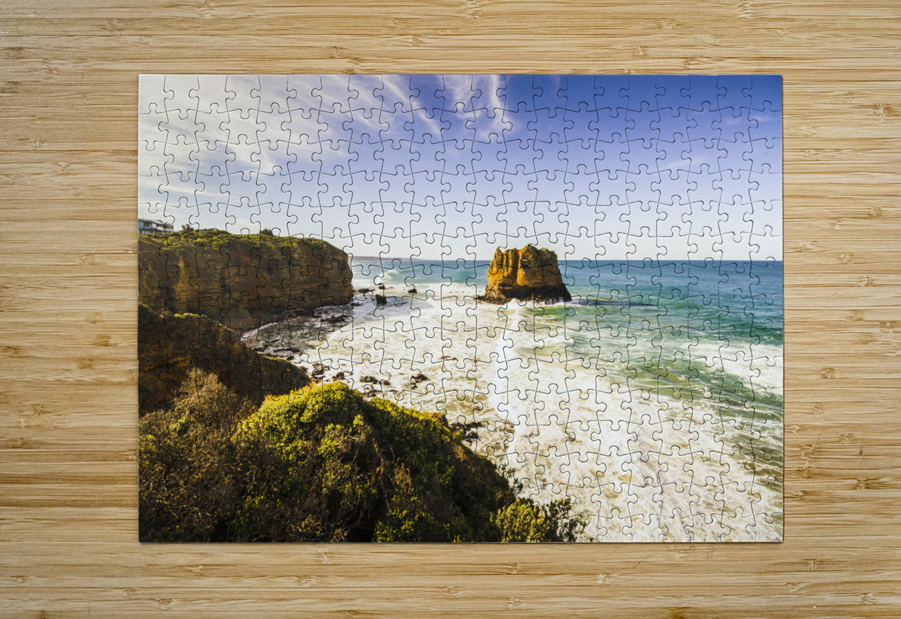 Beautiful landscape with rocky cliffs splashing waves and cloudy blue skies with the focus on the Eagle Rock Tourism landmark. Great Ocean Road Victor...[+]