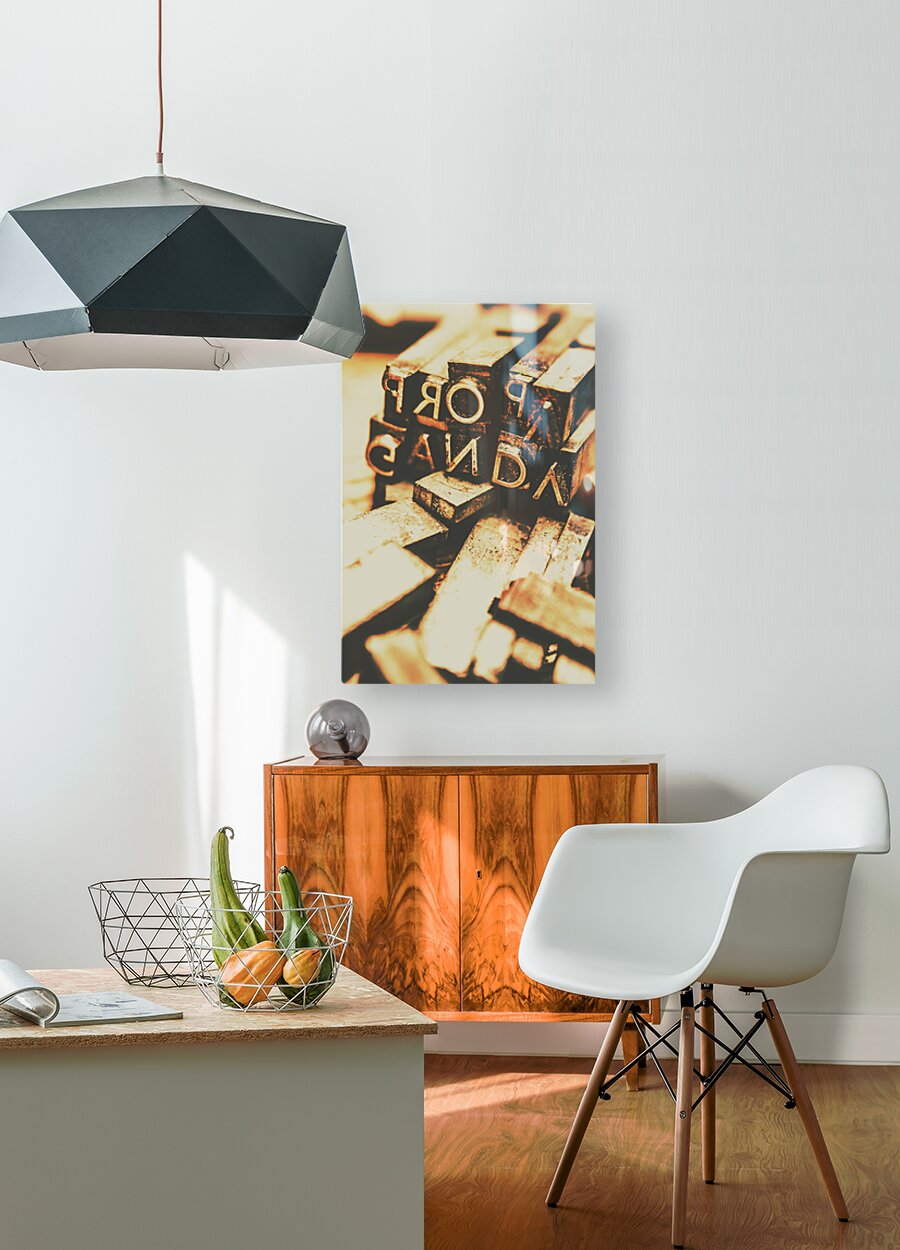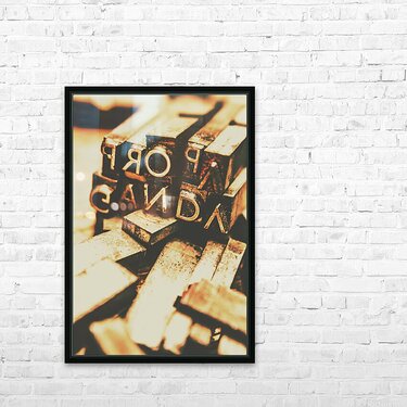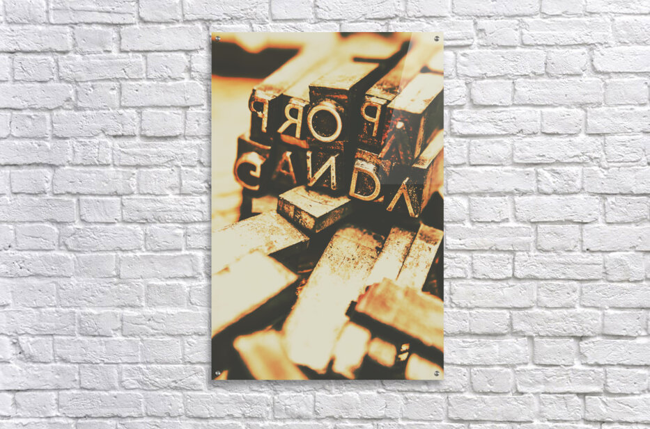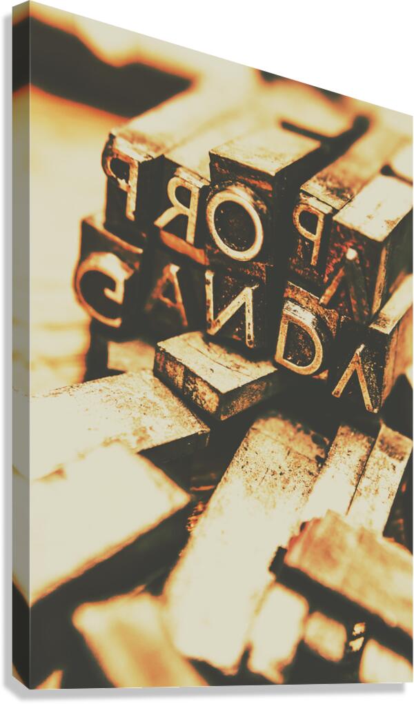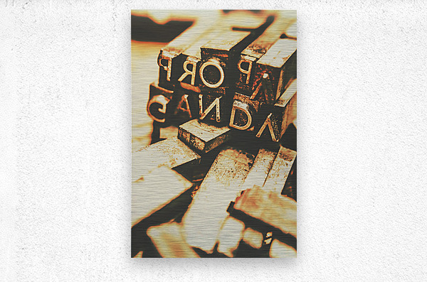 Backwards story of printed media untruth with propaganda spelled out on vintage letterpress blocks. Layers of lies