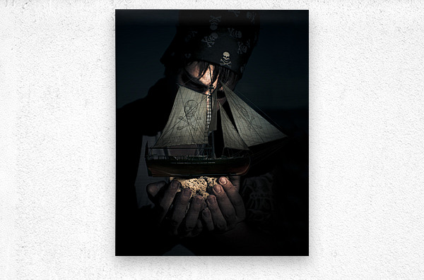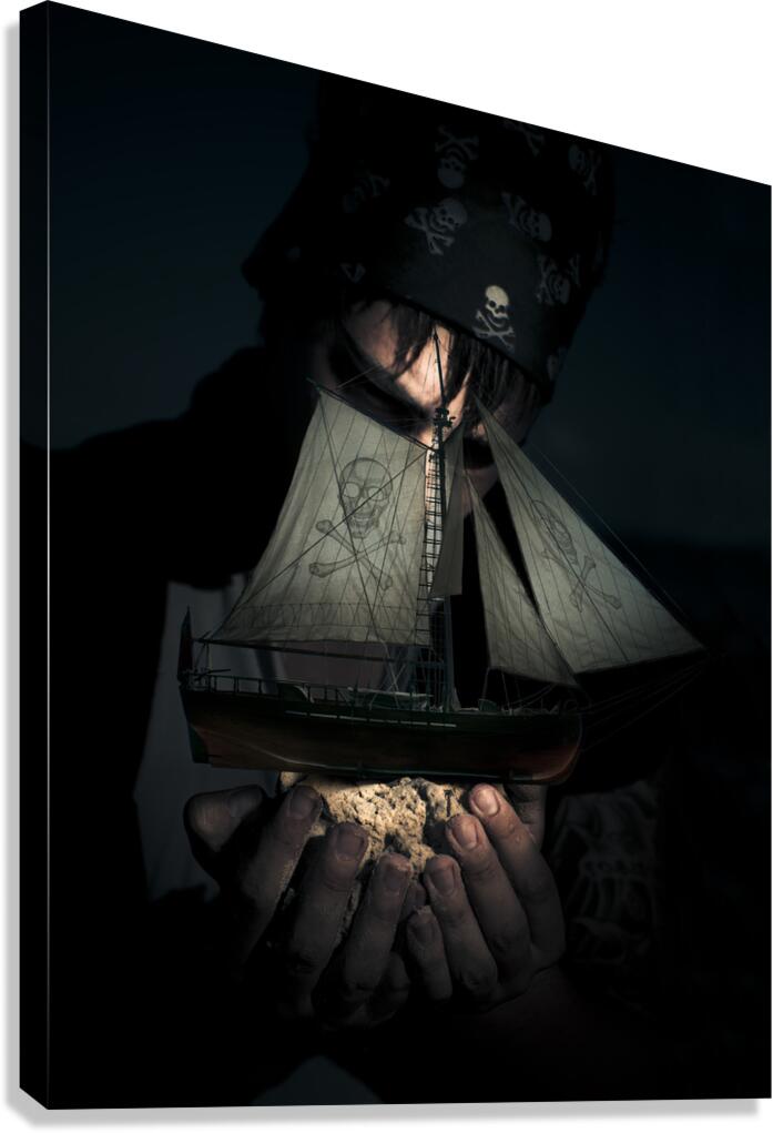 Monster Pirate Standing On A Beach In The Dead Of Night Holds A Skull And Crossbones Pirate Ship On A Handful Of Sand In A Ocean Treasure Concept
