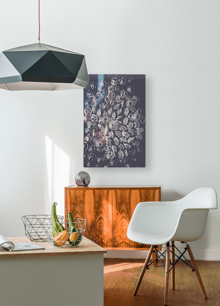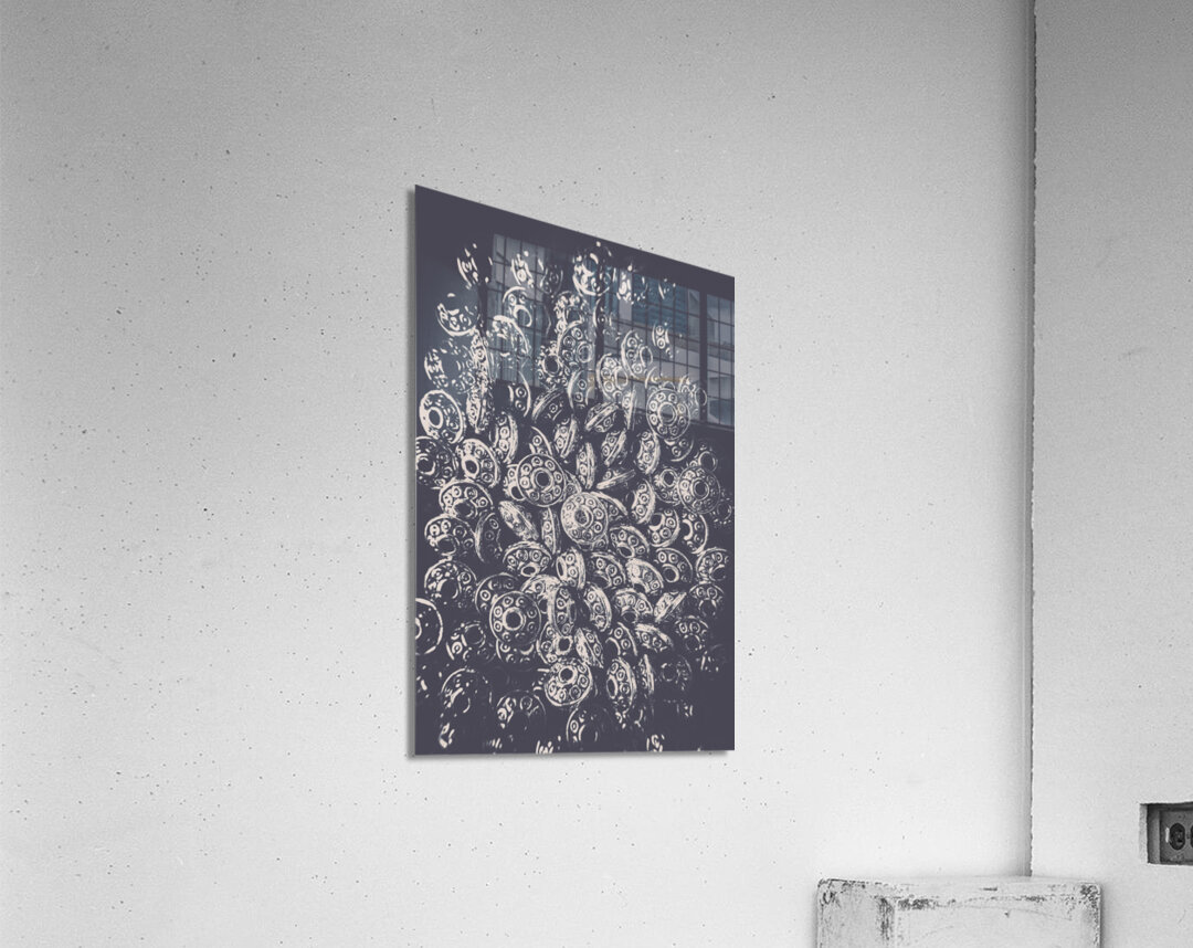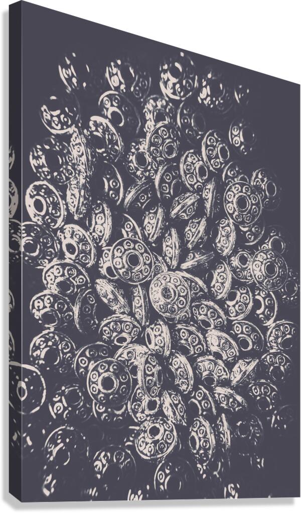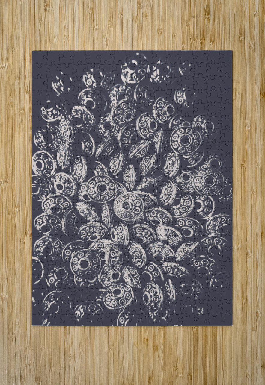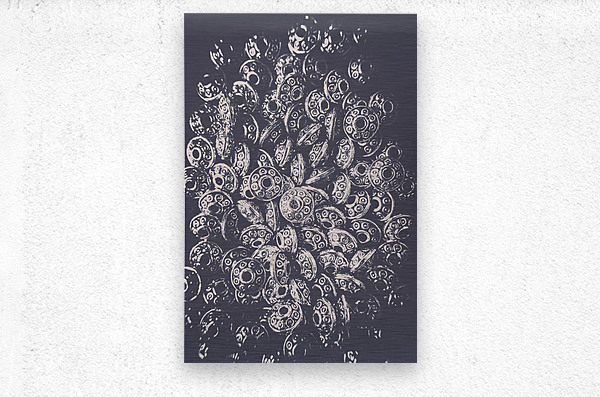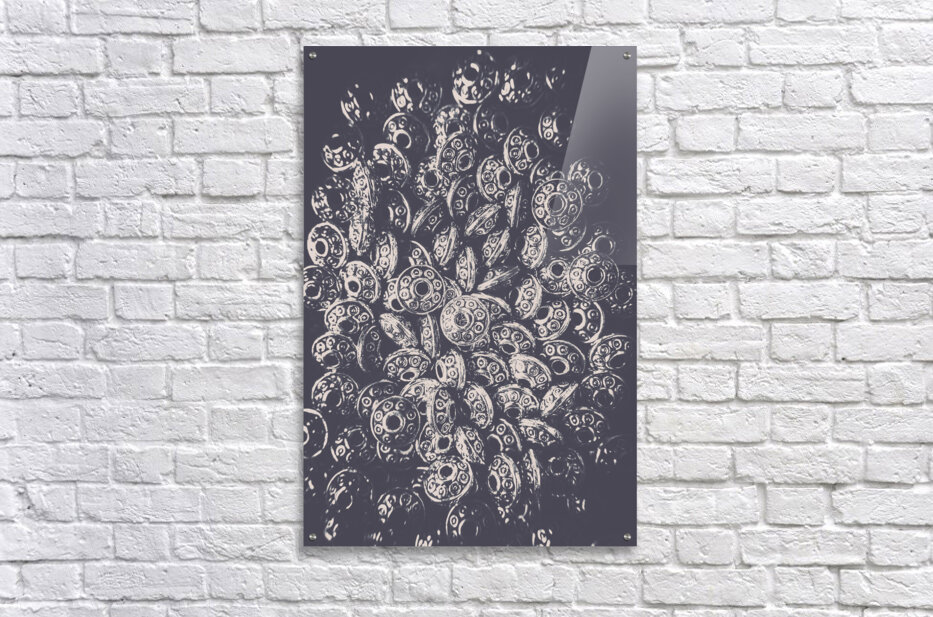 Vintage black and white abstract on a heap of silver UFO flying saucers in a connecting collective
