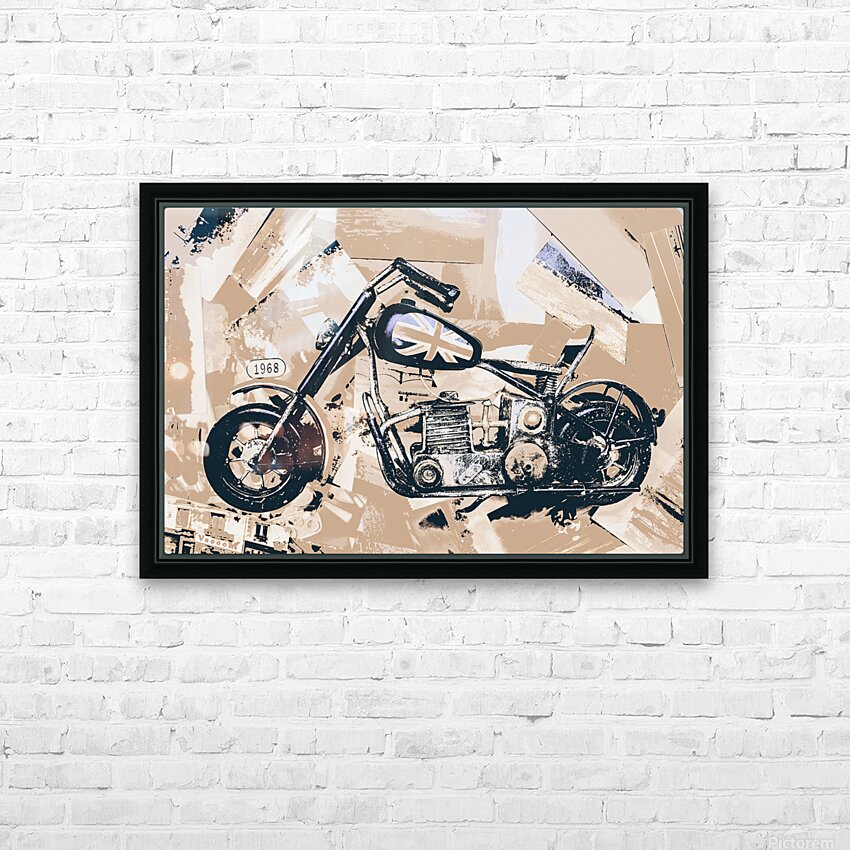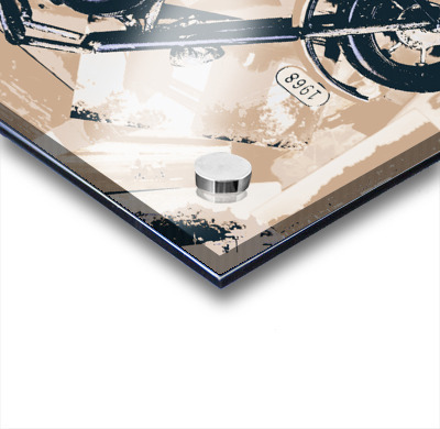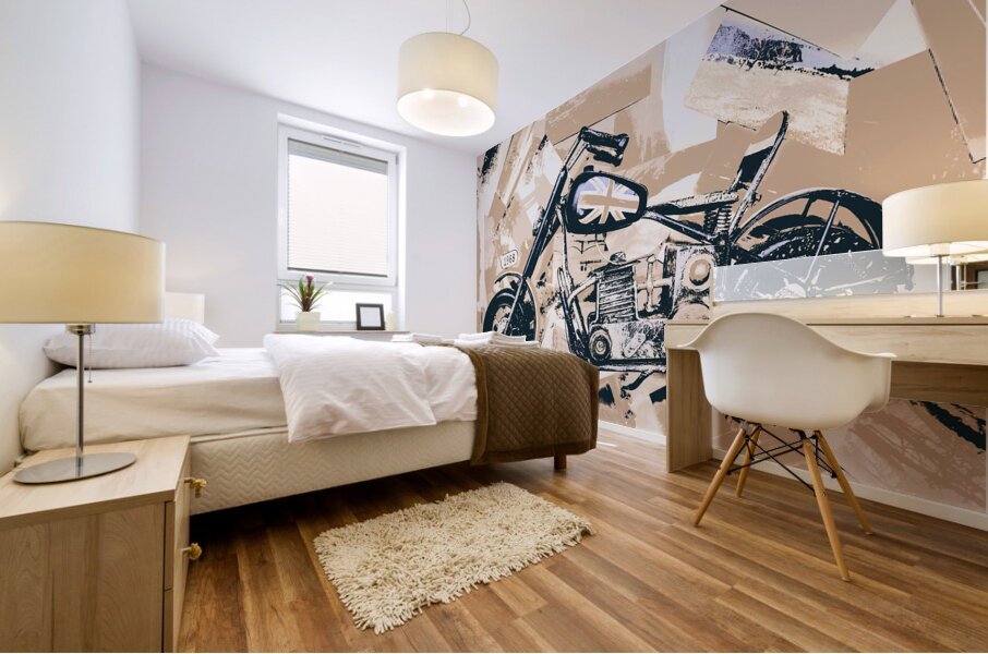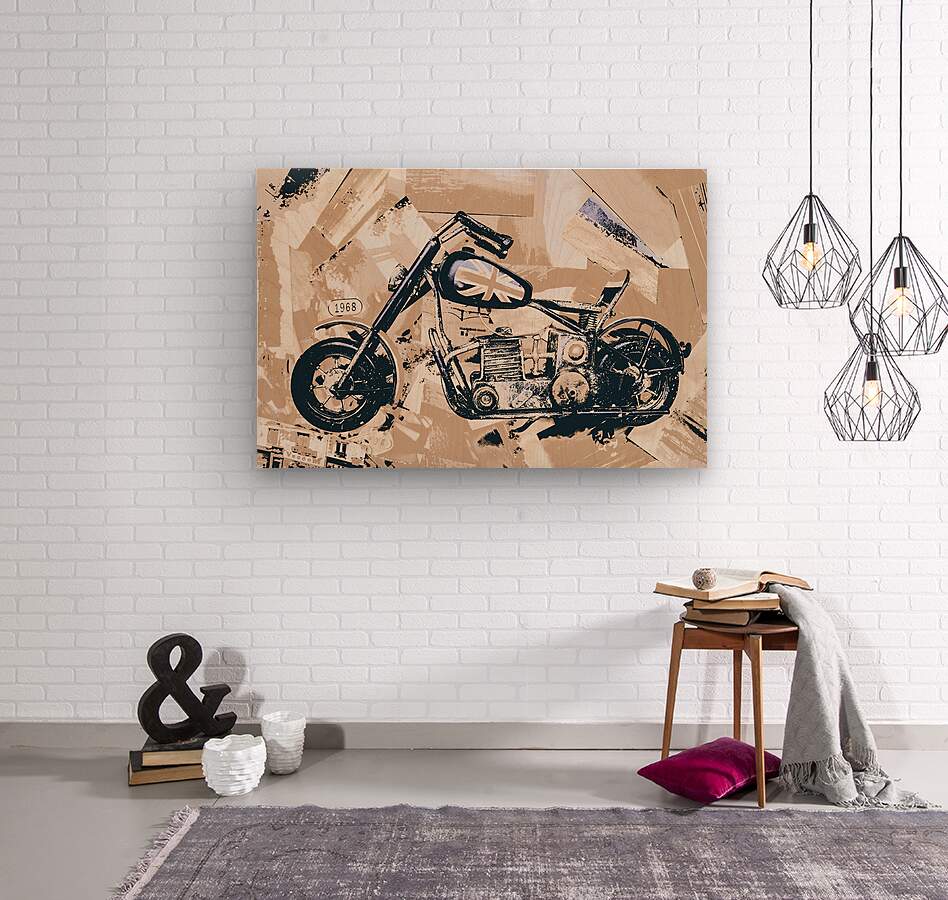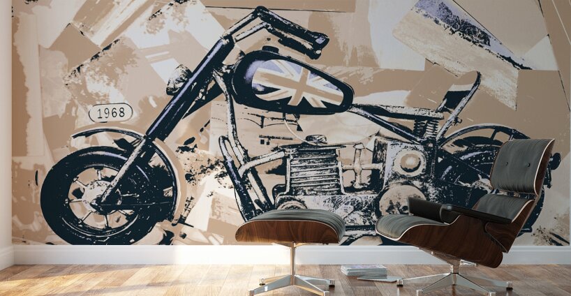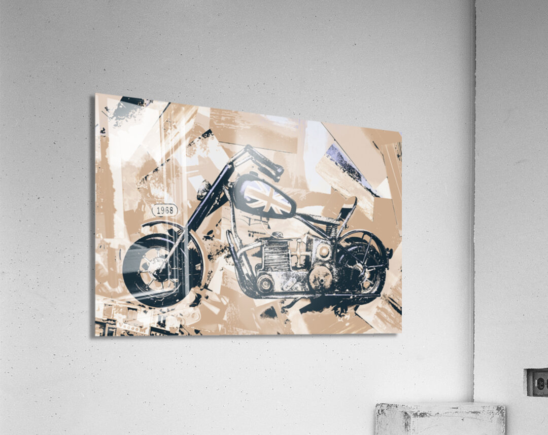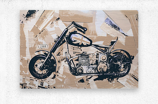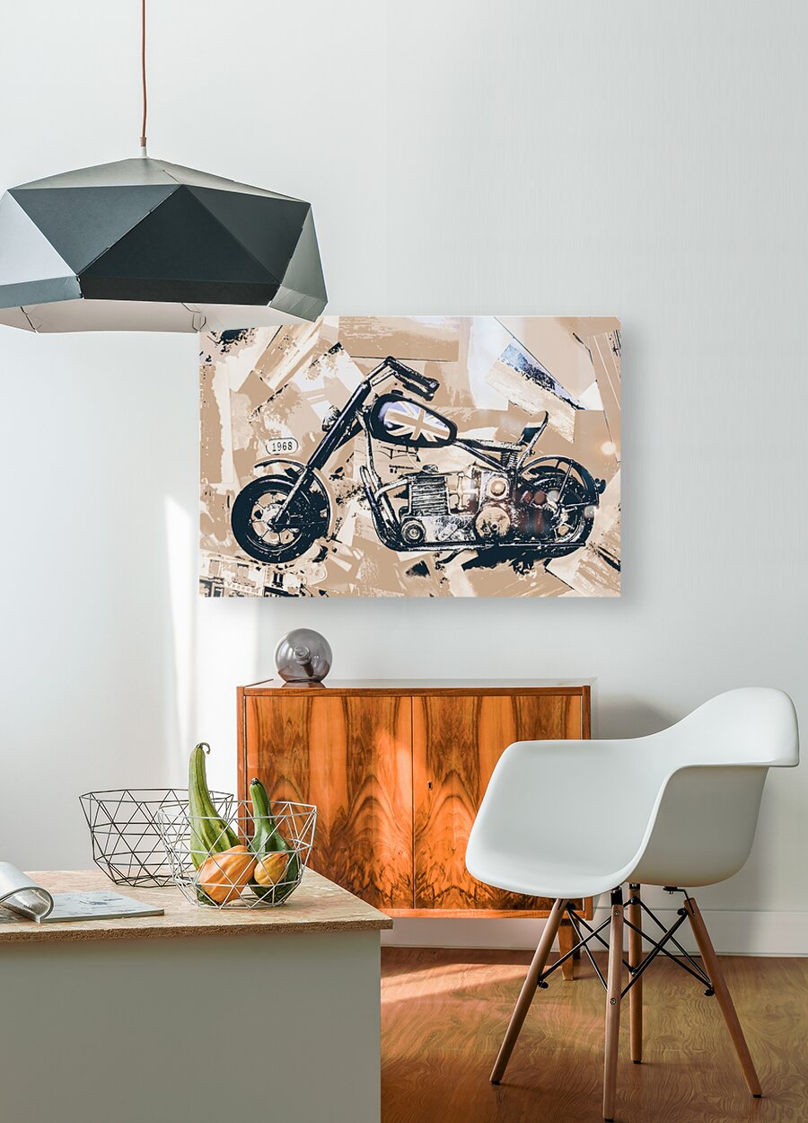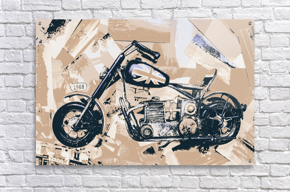 UK poster print on a garage of English auto nostalgia with Brit bike on photos from classic travels. Britain Bike and Co.