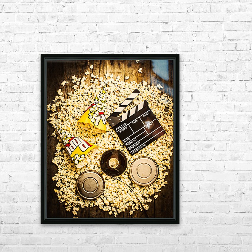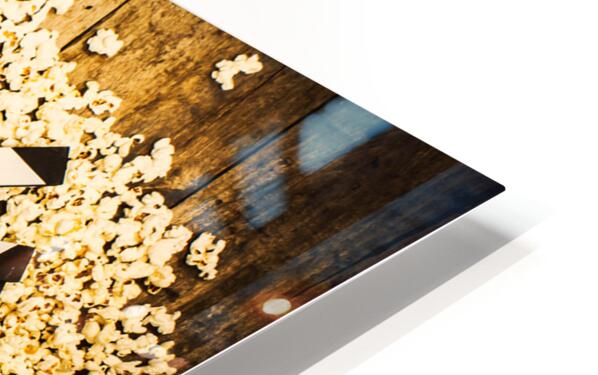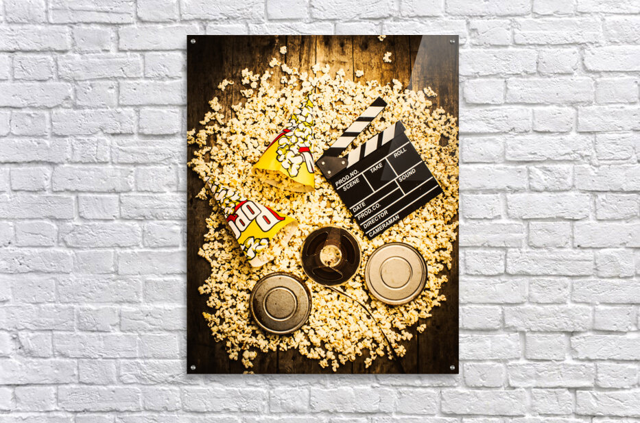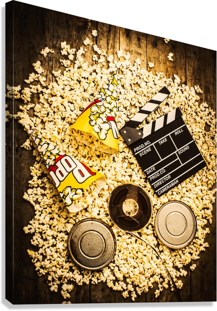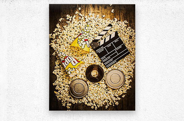 Mix of old-fashioned media objects with antique film production icons scattered on a popcorn background. Cinema of entertainment