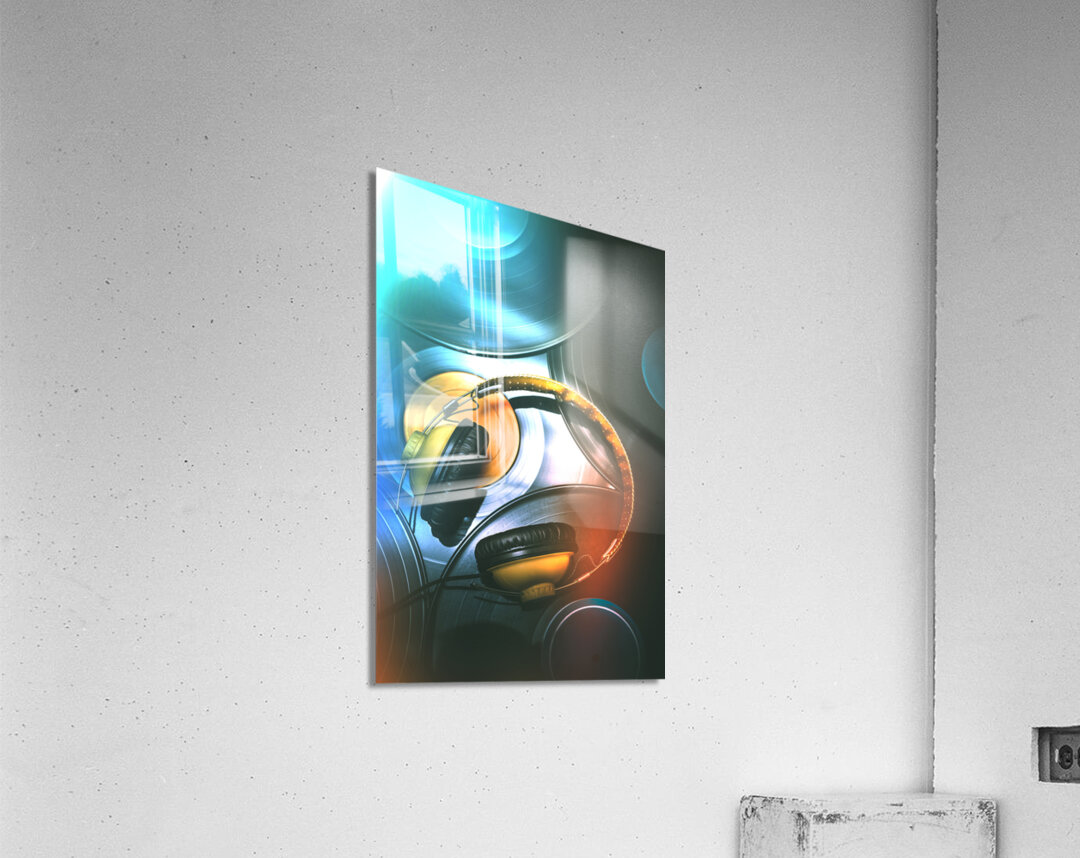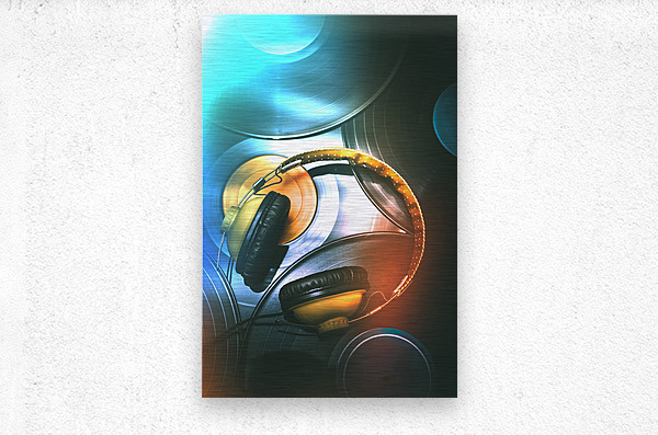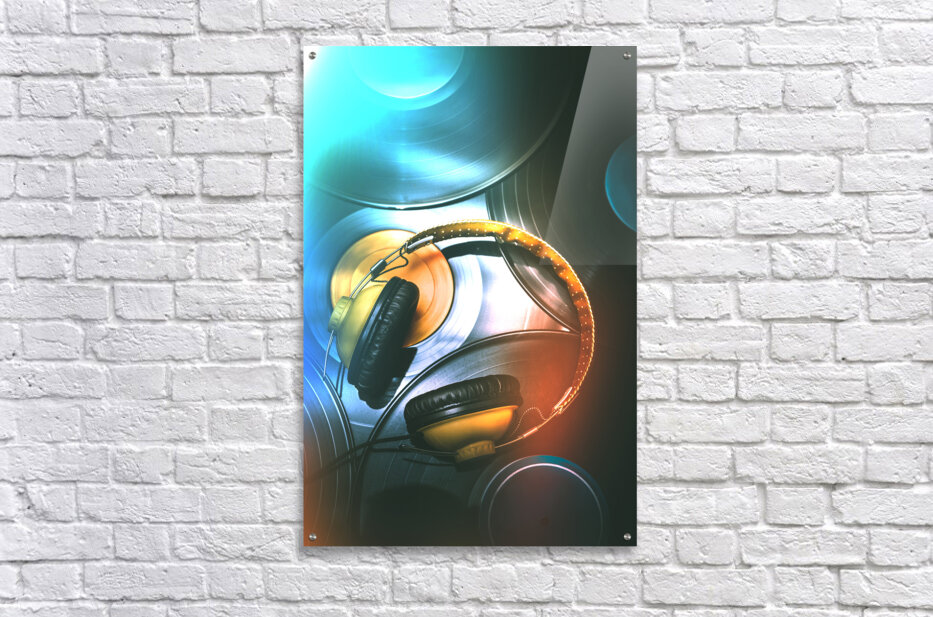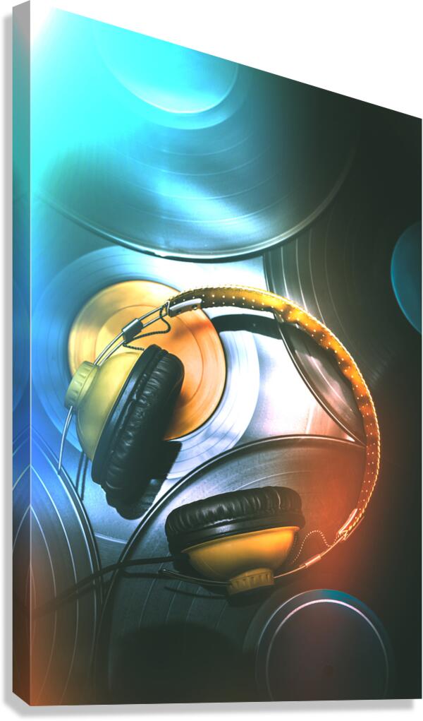 Retro night clubbing mixup on toned headphones with vinyl records over disco light leaks. Sound trance