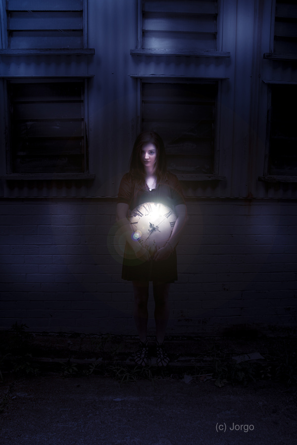 Woman Holding A Clock At Night In From Of A Dark Building Background