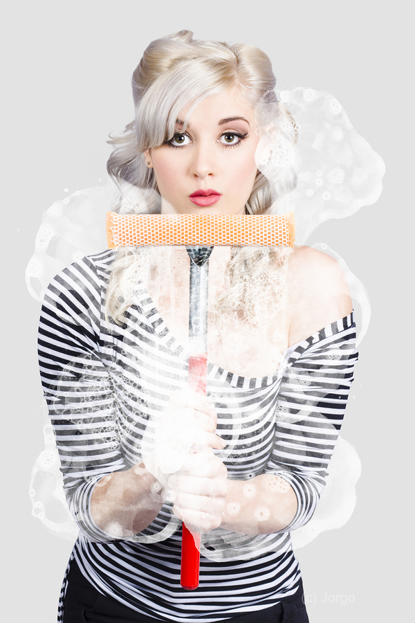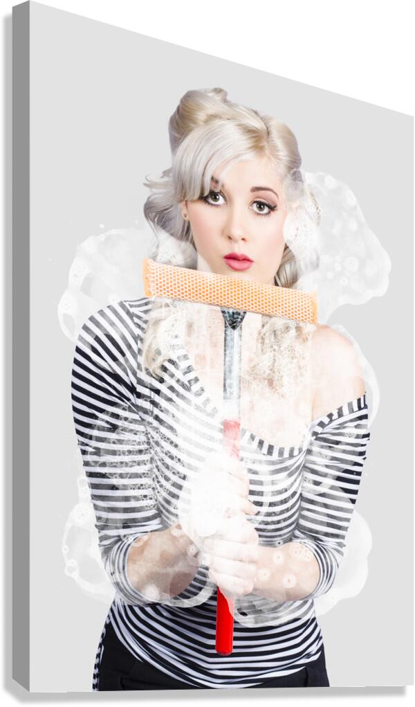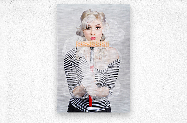 ABOUT THIS ARTWORK: YOUNG WOMAN WASHING EMPTY COPY SPACE WINDOWS