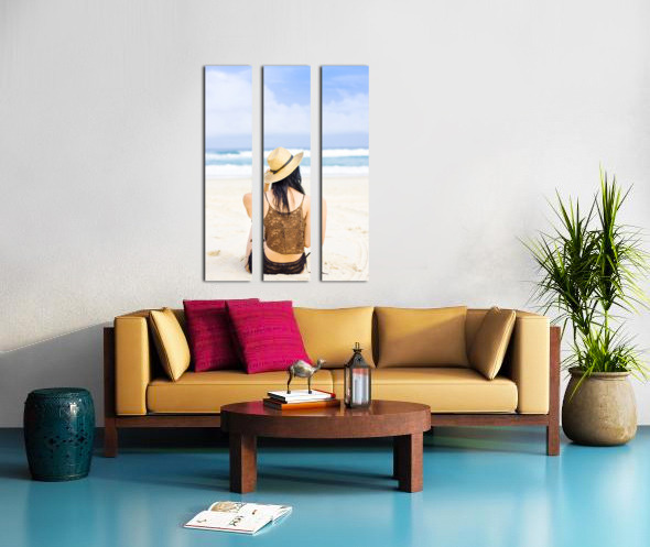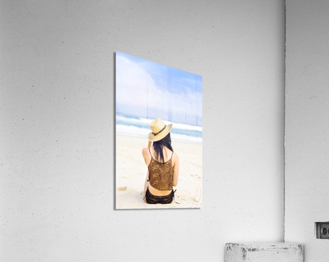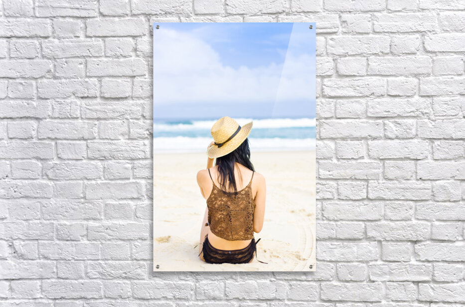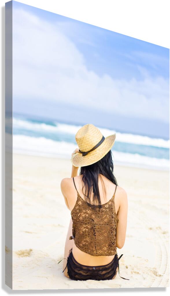 Attractive Female Wearing Bikini And Sun Hat Watching The Ocean Waves Roll Into Shore On A Beautiful Summer Day At The Beach