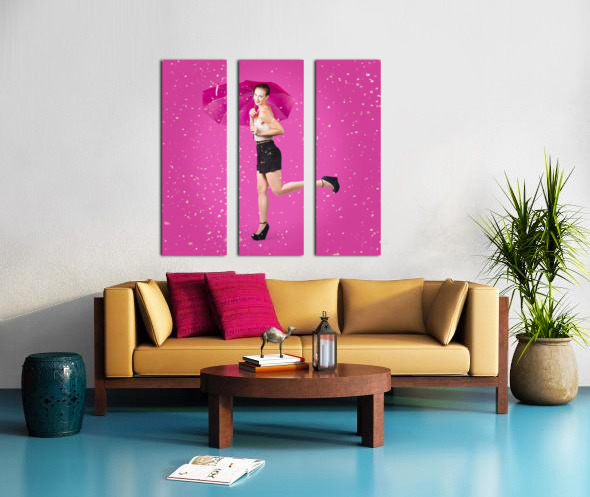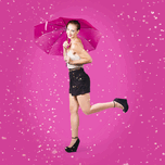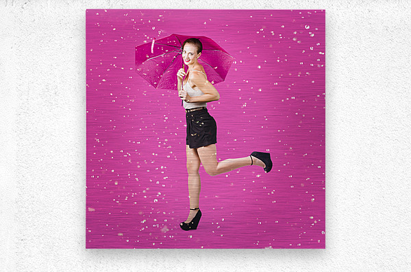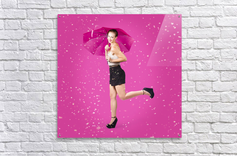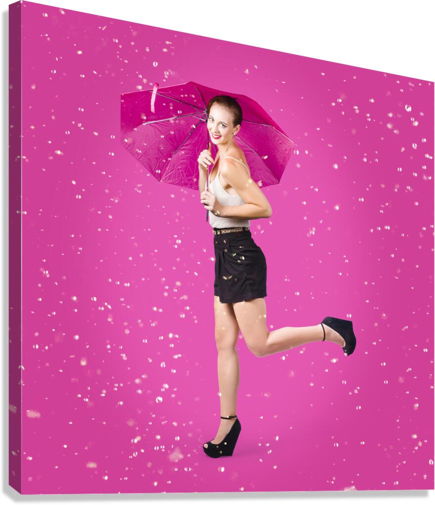 Dashing retro pinup girl popping up one leg with umbrealla when doing a rain dance in fifties fashion. Pink background