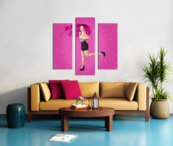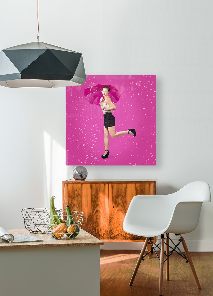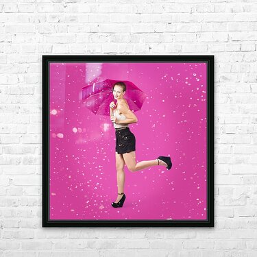 ABOUT THIS ARTWORK: SMILING FEMALE MODEL DANCING IN FALLING RAIN