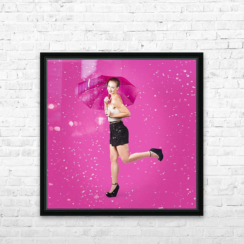 Smiling female model dancing in falling rain Frame print