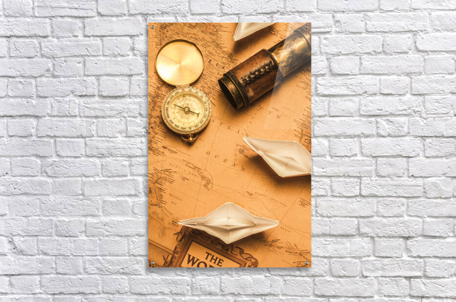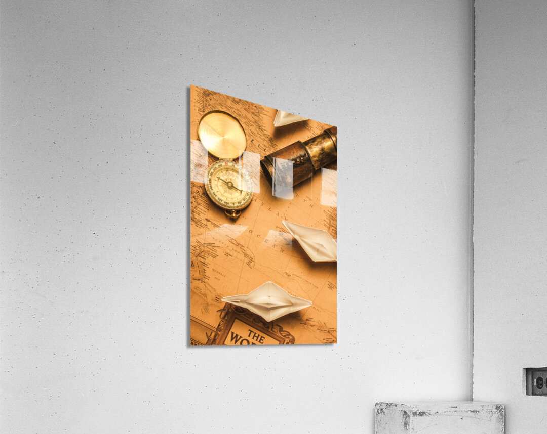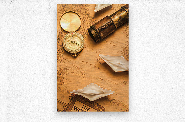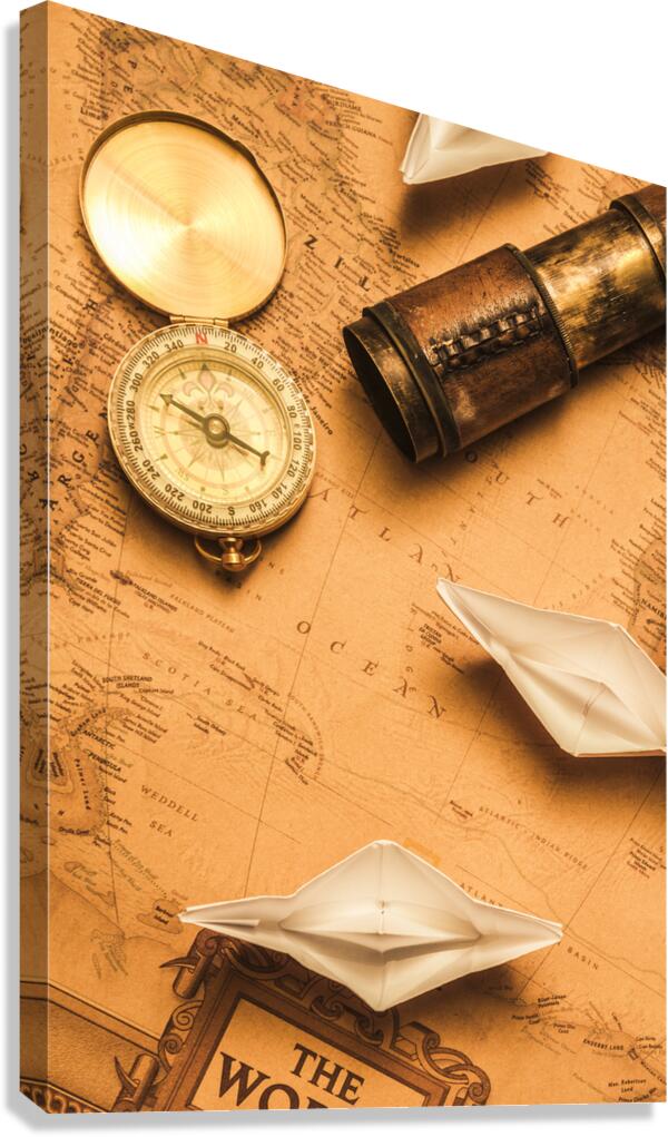 Origami paper boats on a voyage of exploration viewed from above on an ancient chart of the world with vintage brass compass and telescope for navigating the seas