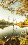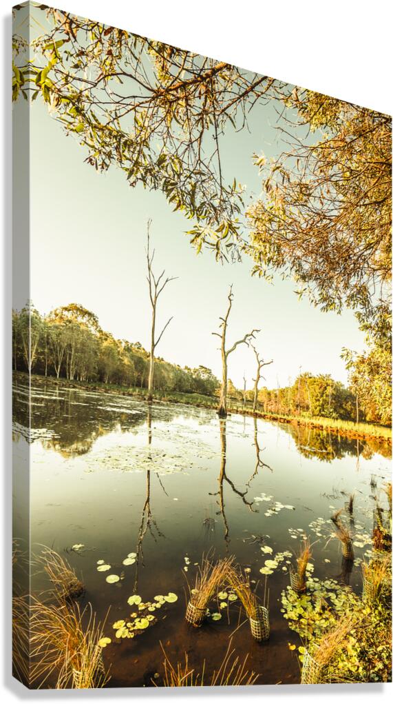 Country lake landscape in vertical orientation with still water and a branch vista. Taken: Murrumba Downs Queensland Australia