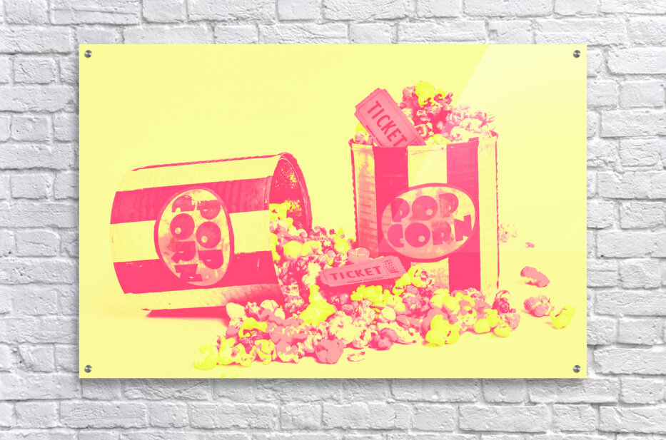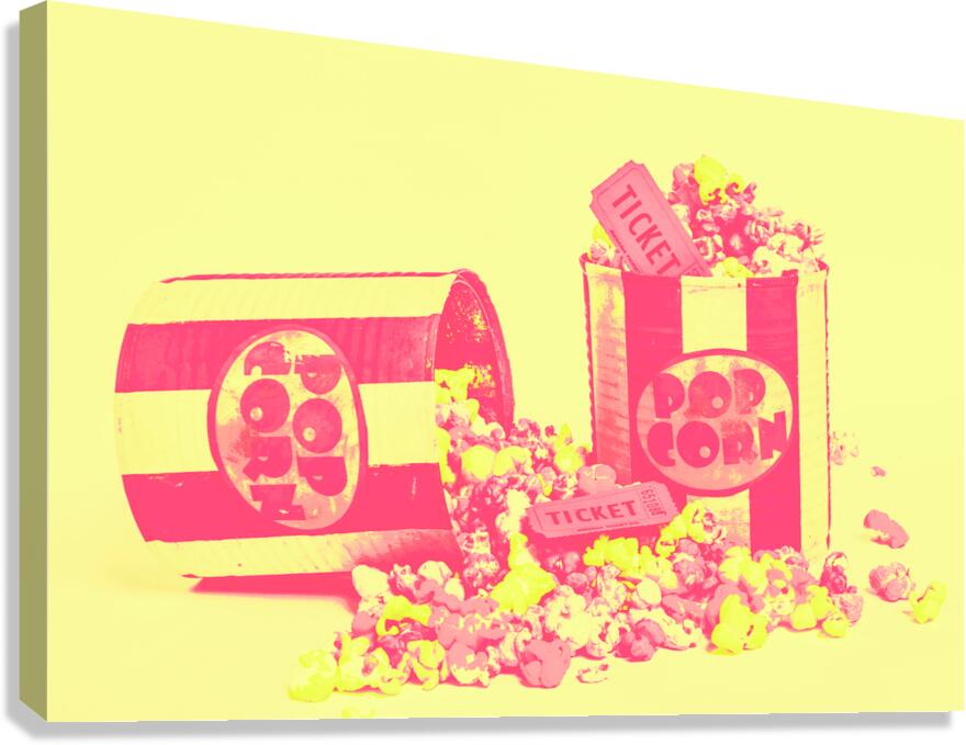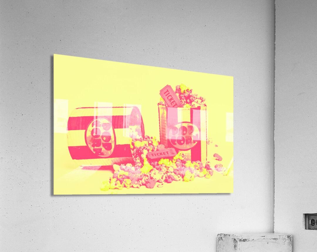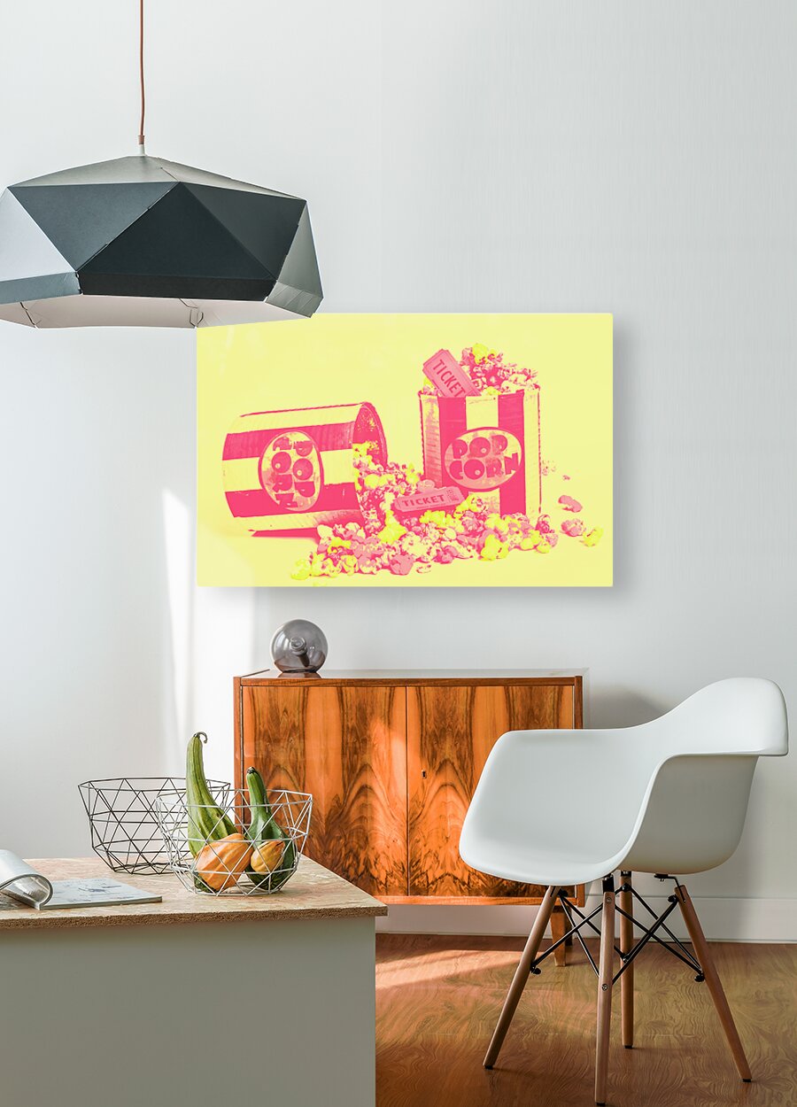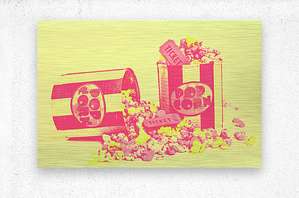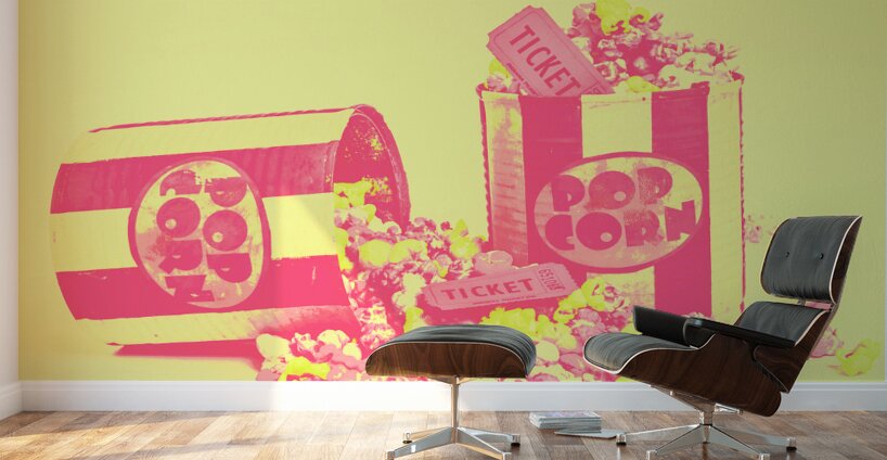 Cine design of pop art cinematics on flowing popcorn kernels and retro ticketing