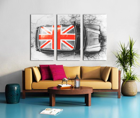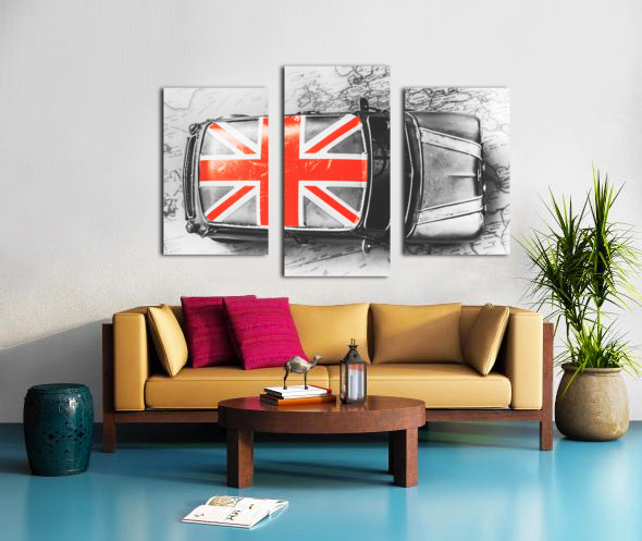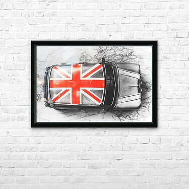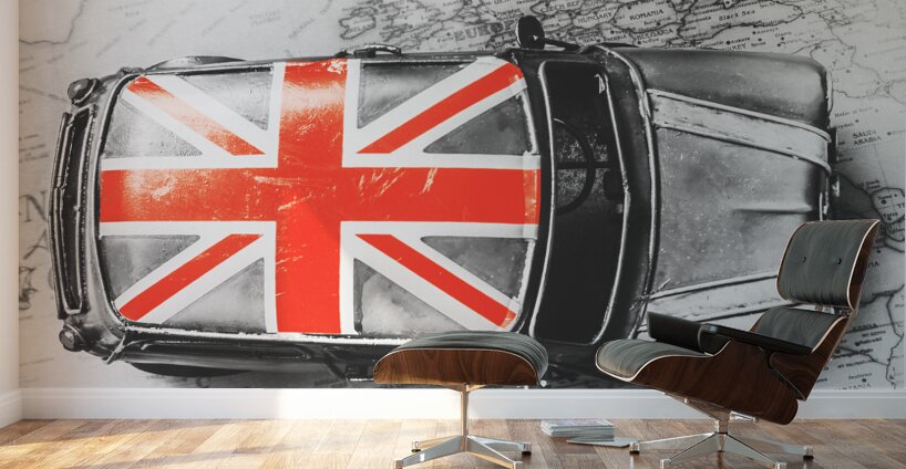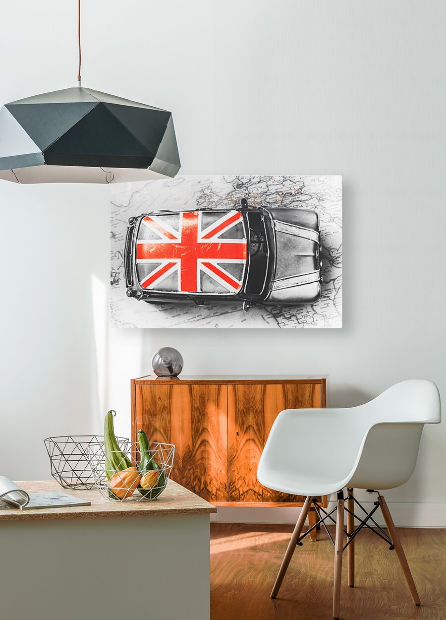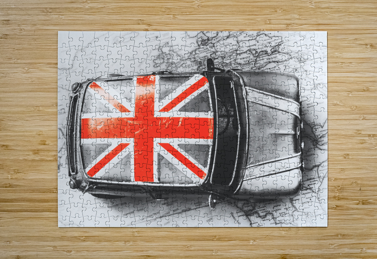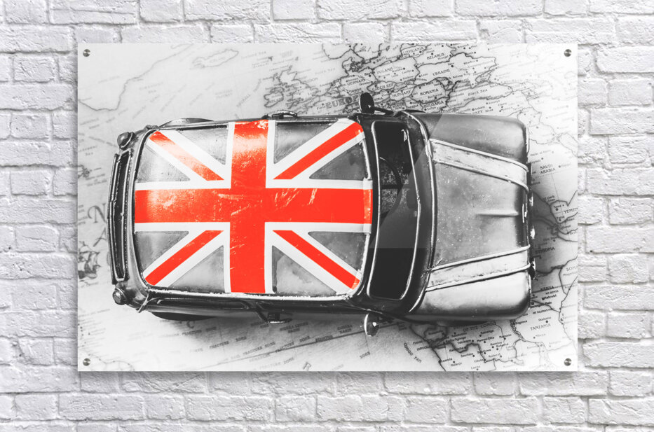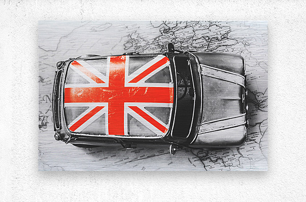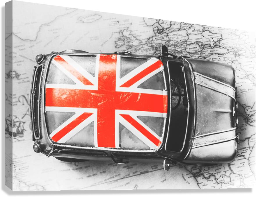 Vintage classic car art on a travel icon from Great Britain with tin toy Mini Cooper on old England map. The British Way