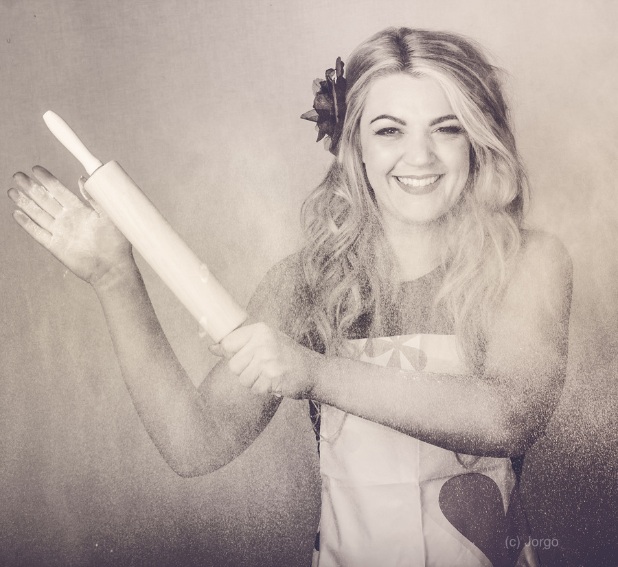 Vintage rolling pin up girl making cooking fun with baking utensils and flour. Old style cook