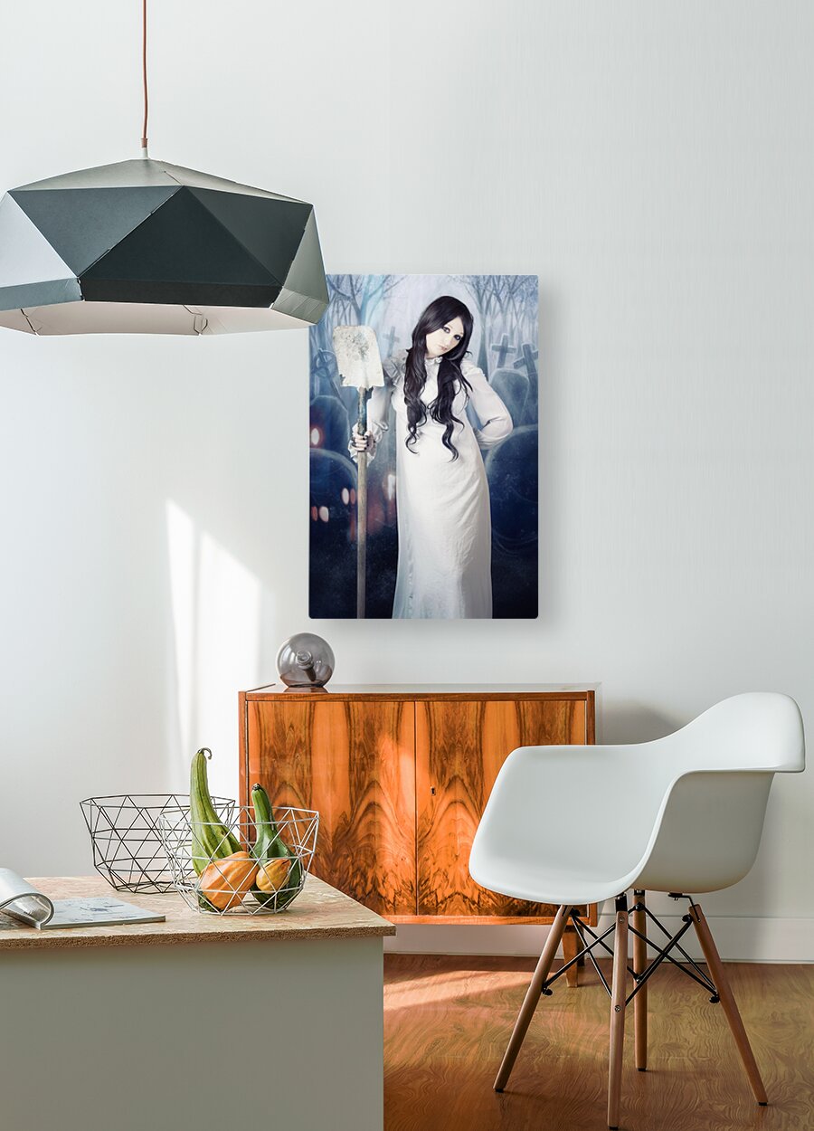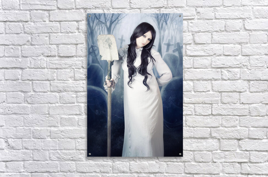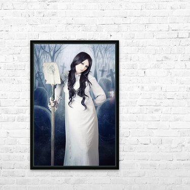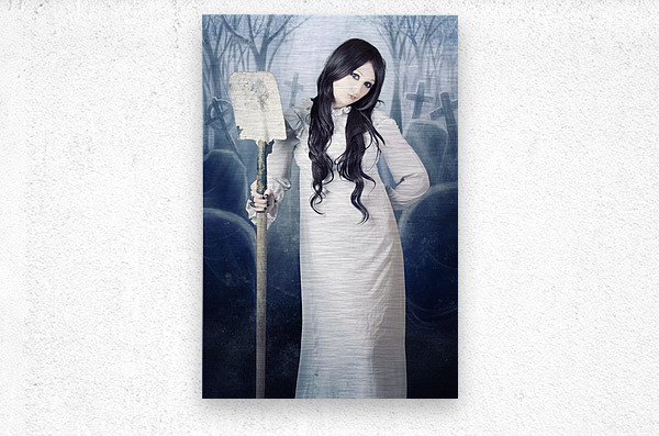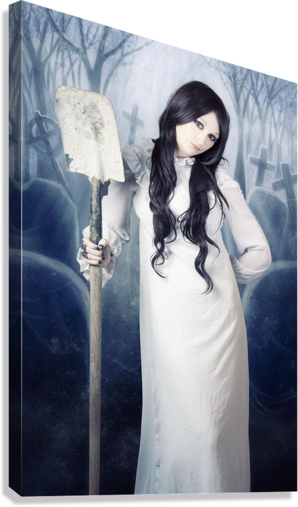 ABOUT THIS ARTWORK: SPOOKY WITCH GRAVEDIGGER WITH SPADE IN GRAVEYARD