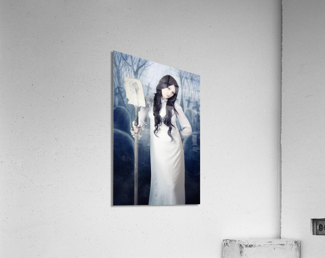 Mysterious woman in long white dress standing in a misty cemetery at the dead of night with shovel in hand digging up graves and resurrecting the dead...[+]