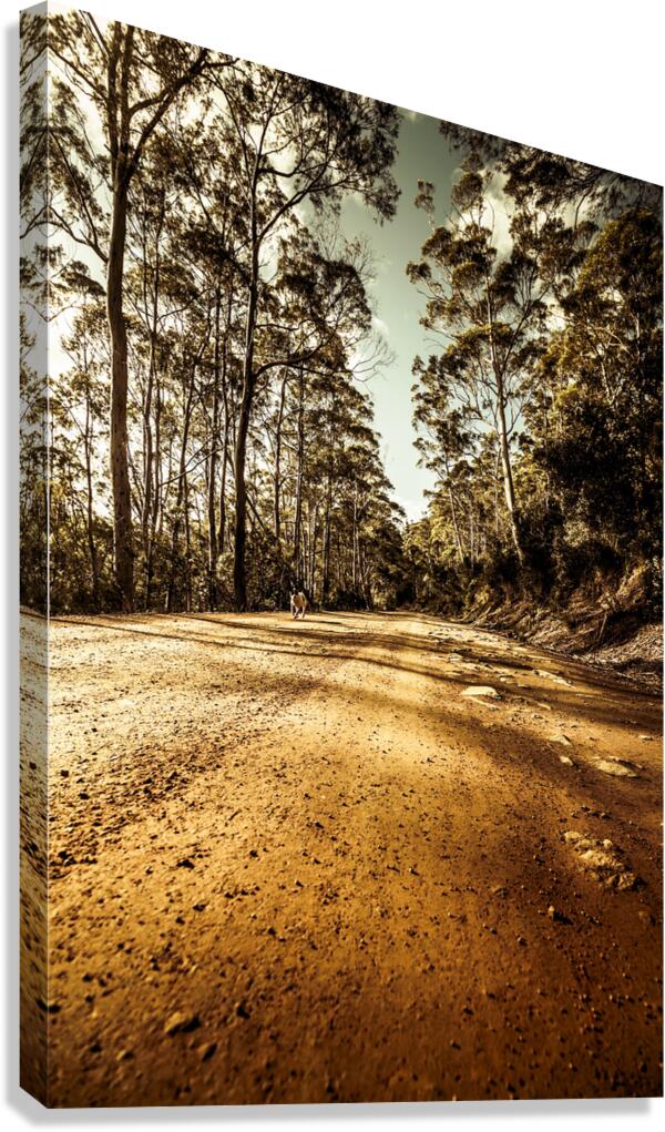 Off-road exploration concept of a dirt and rock road leading straight thoroughfare a mountainous range. Off the beaten track taken: Judbury Tasmania A...[+]