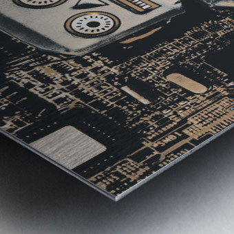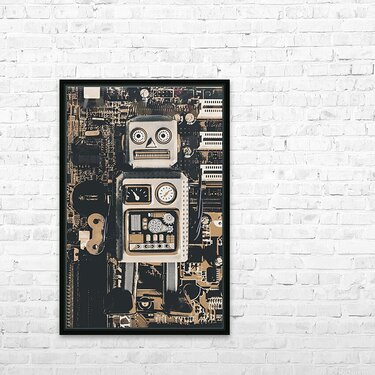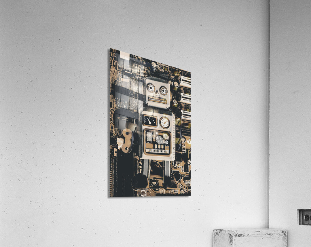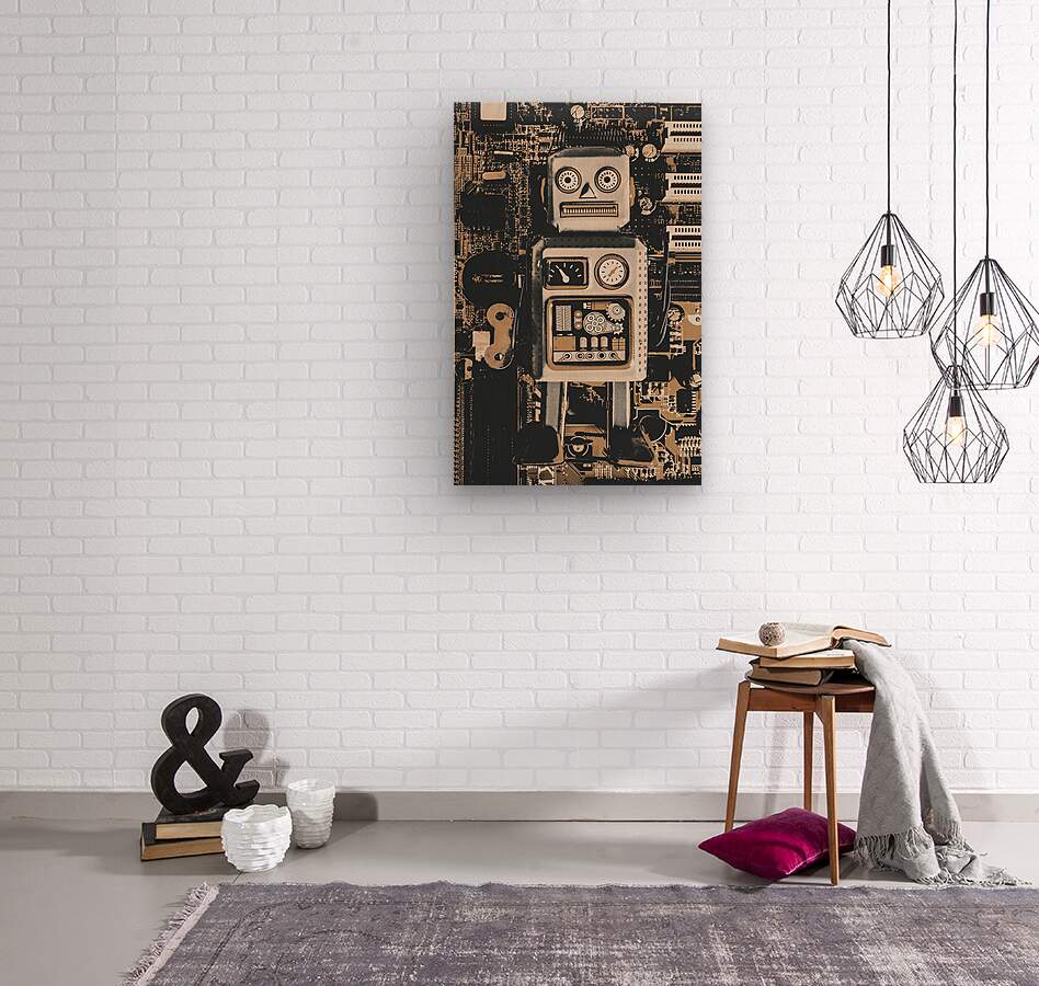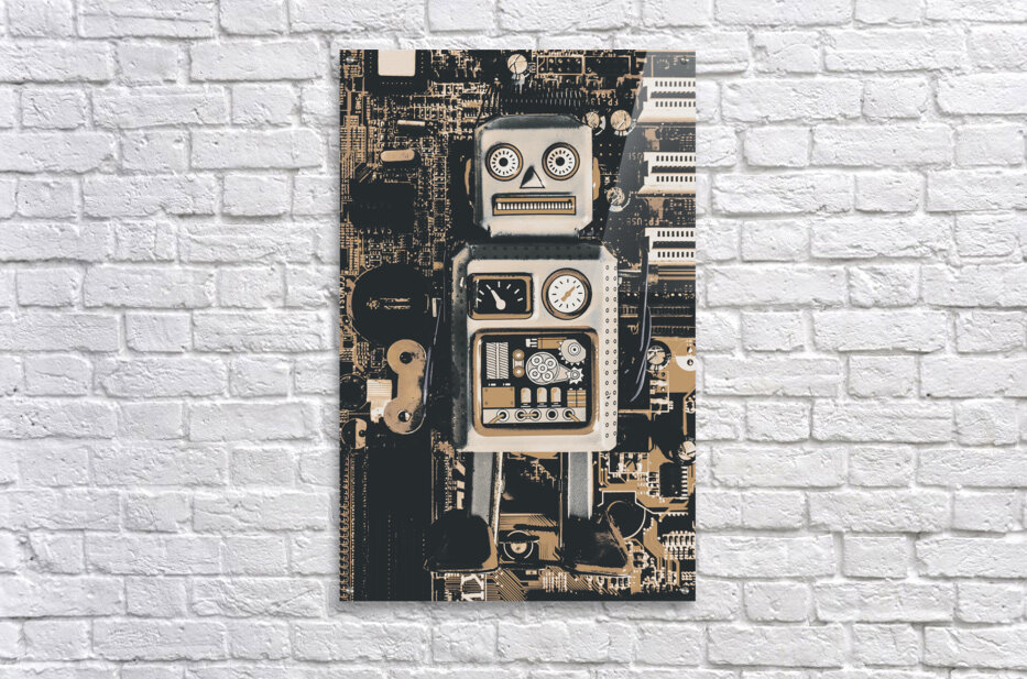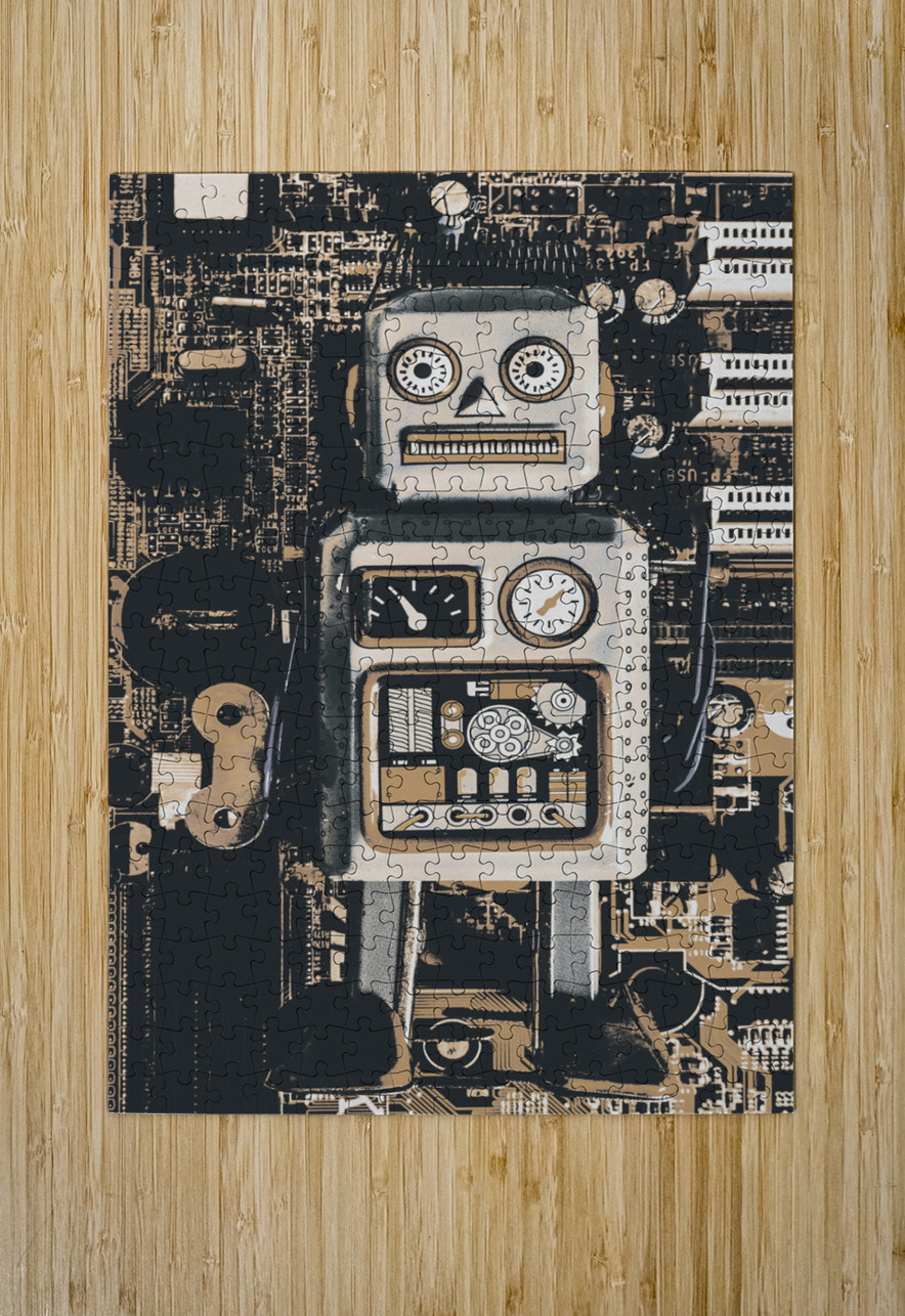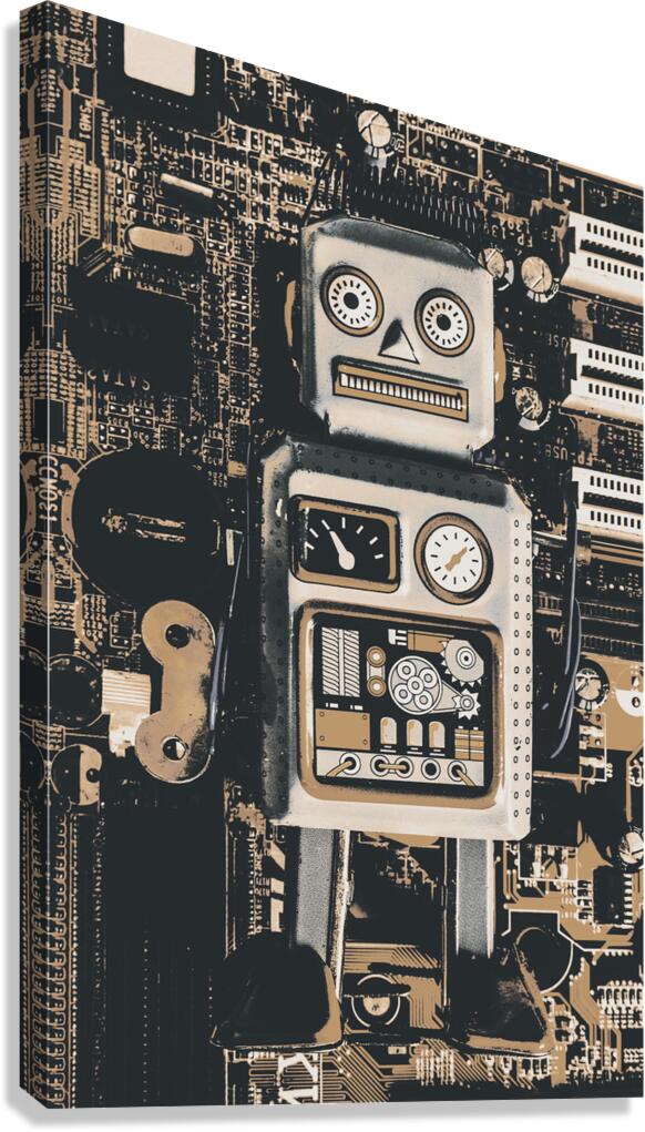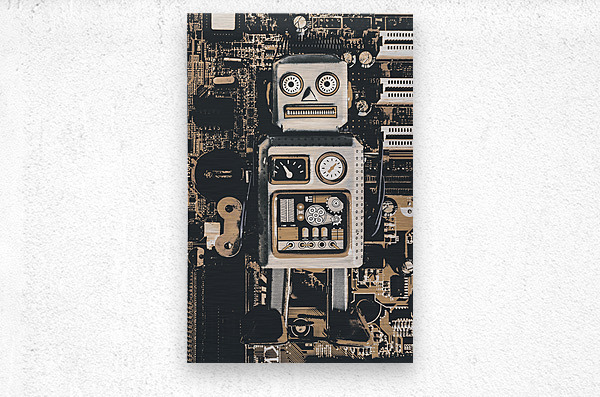 Classic antique toy art on a layout of rustic robots on electronic circuit boards