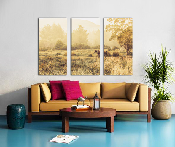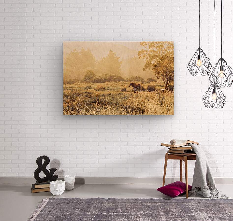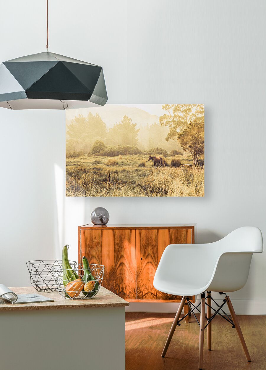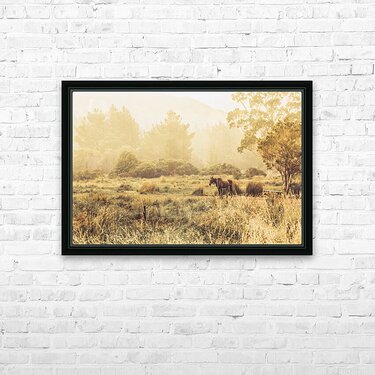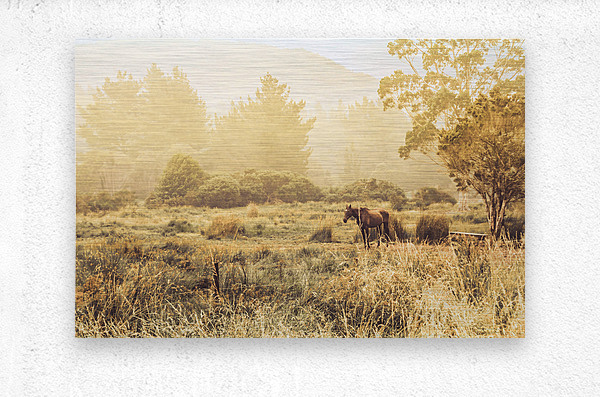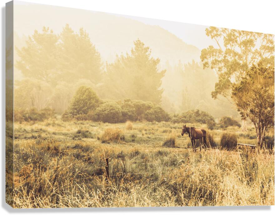Rural countryside landscape with misty farmyard and distant horse. Taken Zeehan Tasmania Australia