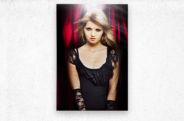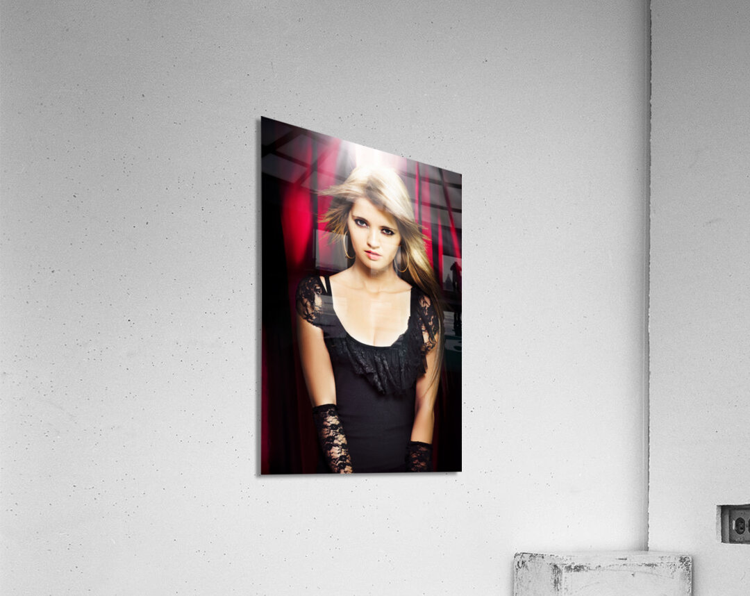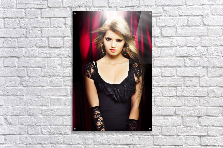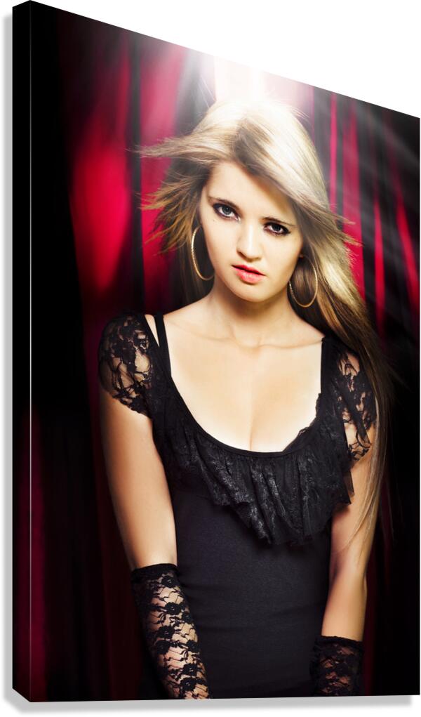 A red curtain theatre performance sees a gorgeous young blond woman with windswept hairstyle dance under dazzling stage spotlights
